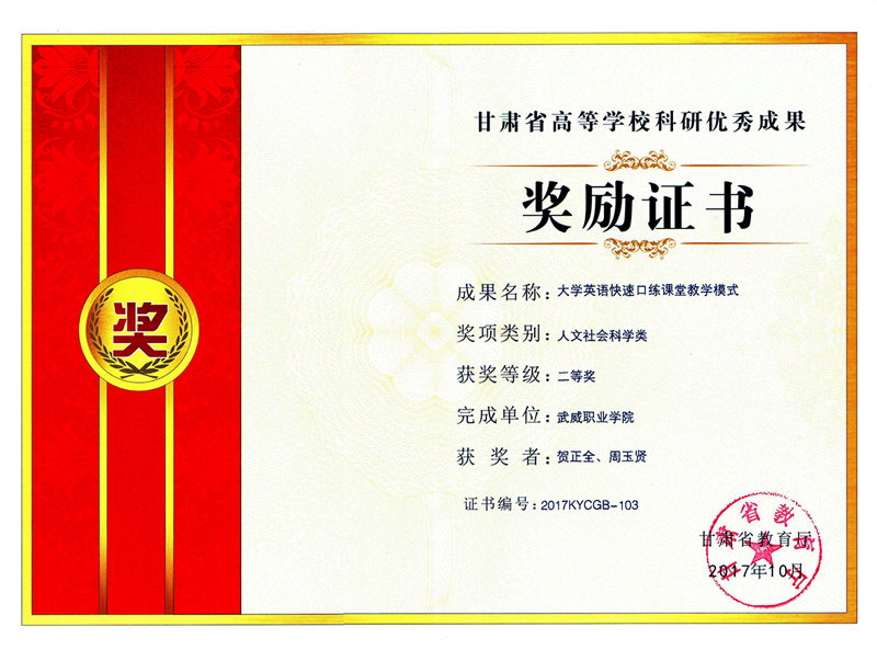 近日從學院科研處傳來喜訊,我系教師賀正全申報的《大學英語快速口練課堂教學模式》榮獲甘肅省教育廳頒發(fā)的2017年甘肅省高等學??蒲袃?yōu)秀成果二等獎。這是我院自建院以來獲得的最高級別的高校科研優(yōu)秀成果獎。本次獲得二等獎的科研成果共有154項,其中高職高專報送的科研成果只有9項獲得二等獎。