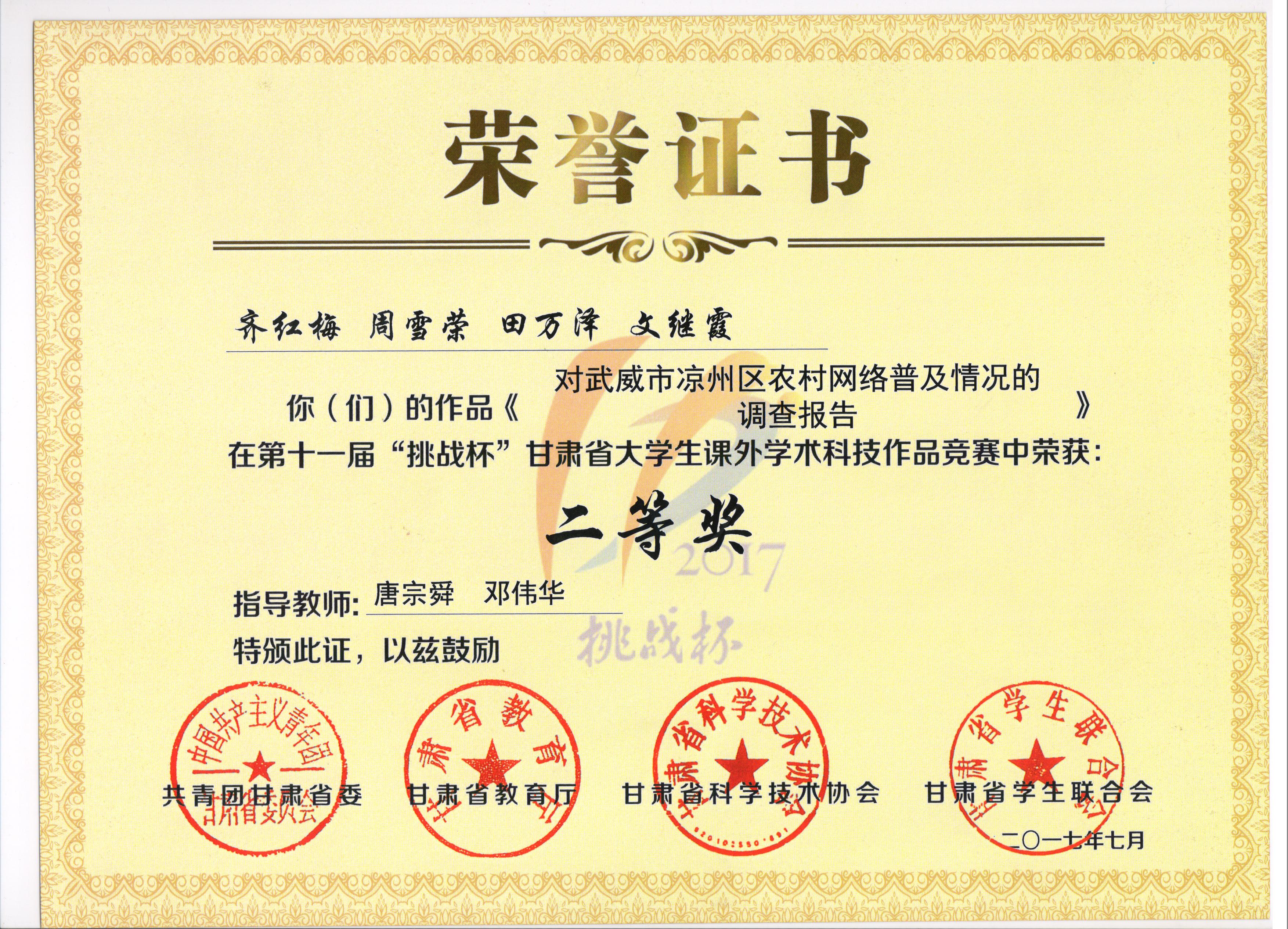 決賽期間,副院長田迎春作為嘉賓出席了終審決賽開幕式,并親臨展演現(xiàn)場指導,鼓勵同學們取得好成績。在公開展示、現(xiàn)場路演、終審答辯等環(huán)節(jié),我院代表隊表現(xiàn)出色,給評審專家和前來觀摩的各高校師生留下了深刻的印象。最終經(jīng)過評審委員會終審評審,電子信息工程系選送的《對武威市涼州區(qū)農(nóng)村網(wǎng)絡普及情況的調查報告》作品榮獲二等獎?! ?/p>