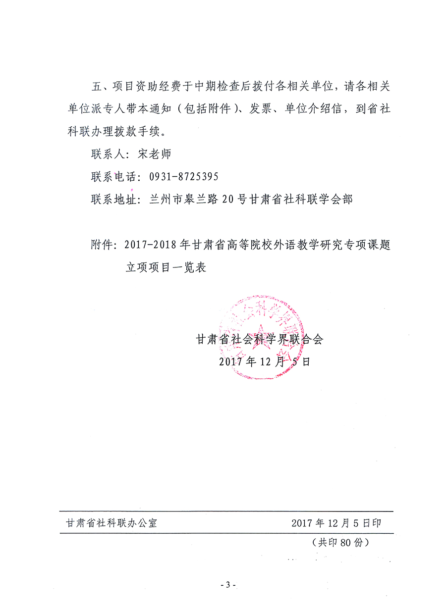 轉(zhuǎn)發(fā)甘肅省社科聯(lián)“關(guān)于2017-2018年甘肅省高等院校外語(yǔ)教學(xué)研究專項(xiàng)課題立項(xiàng)的通知”