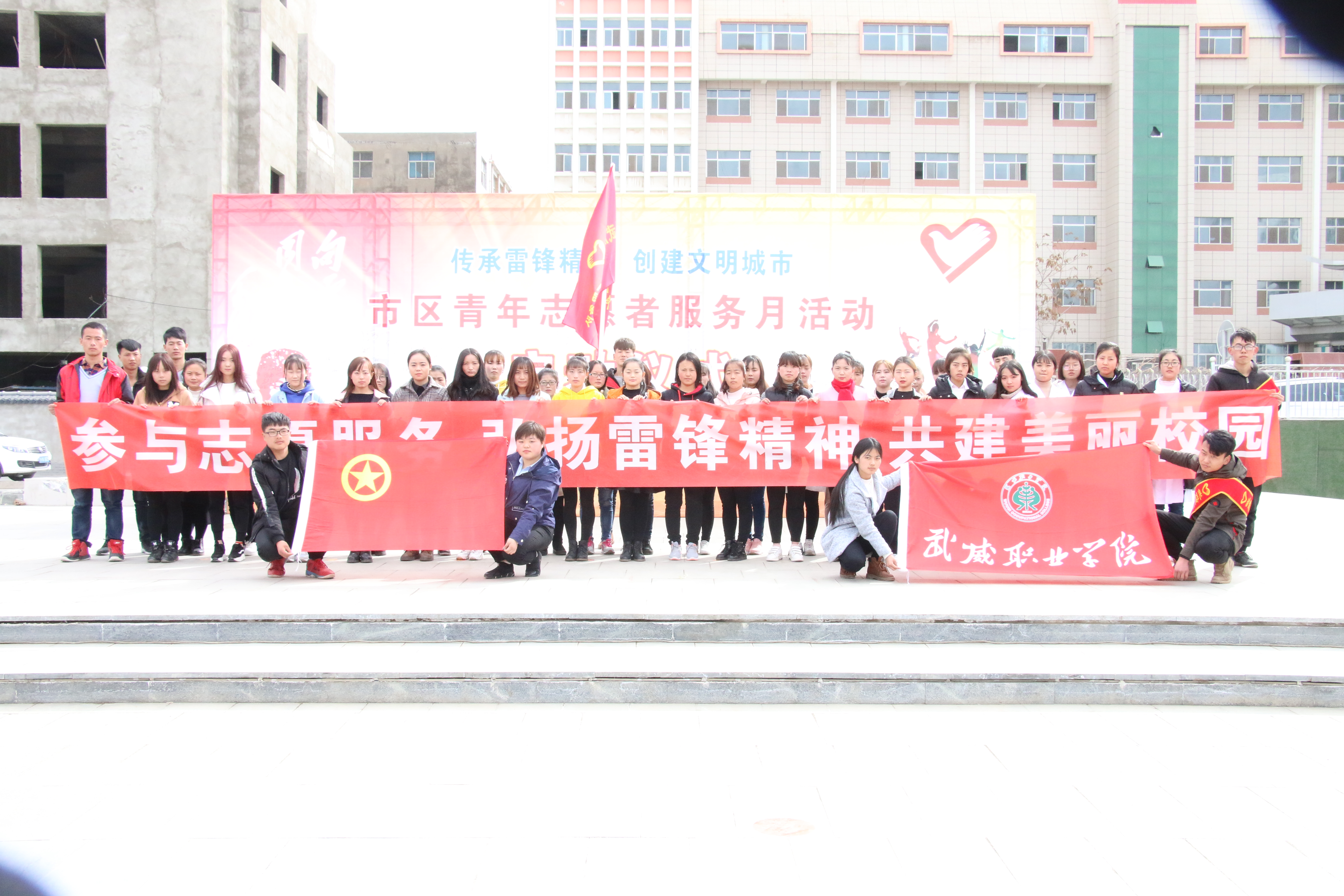 今年是毛澤東等老一輩革命家為雷鋒同志題詞55周年,3月5日是中國(guó)青年志愿者服務(wù)日。 3月5日下午,學(xué)院50名志愿者在武威市文化廣場(chǎng)參加了全市志愿者服務(wù)月活動(dòng)啟動(dòng)儀式,活動(dòng)現(xiàn)場(chǎng)氣氛熱烈,市領(lǐng)導(dǎo)為我院志愿服務(wù)隊(duì)進(jìn)行了授旗,青年志愿者代表宣讀了倡議書,全體志愿者重溫了青年志愿者誓詞。