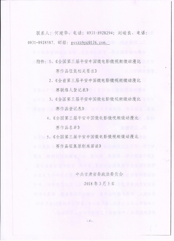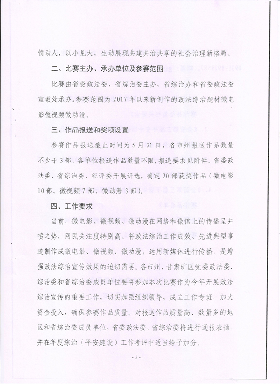 現(xiàn)將甘肅省教育廳關(guān)于轉(zhuǎn)發(fā)《省委政法委<關(guān)于組織參加全國第三屆平安中國微電影微視頻微動漫比賽的通知>》(甘政法明電〔2018〕12號)轉(zhuǎn)發(fā)你們,請各部門、單位根據(jù)要求廣泛動員,積極參與。將參賽作品存儲在移動硬盤或數(shù)碼U盤中,于5月10日前報宣傳統(tǒng)戰(zhàn)部辦公室,宣傳統(tǒng)戰(zhàn)部對報送作品匯總后統(tǒng)一報送省教育廳。
