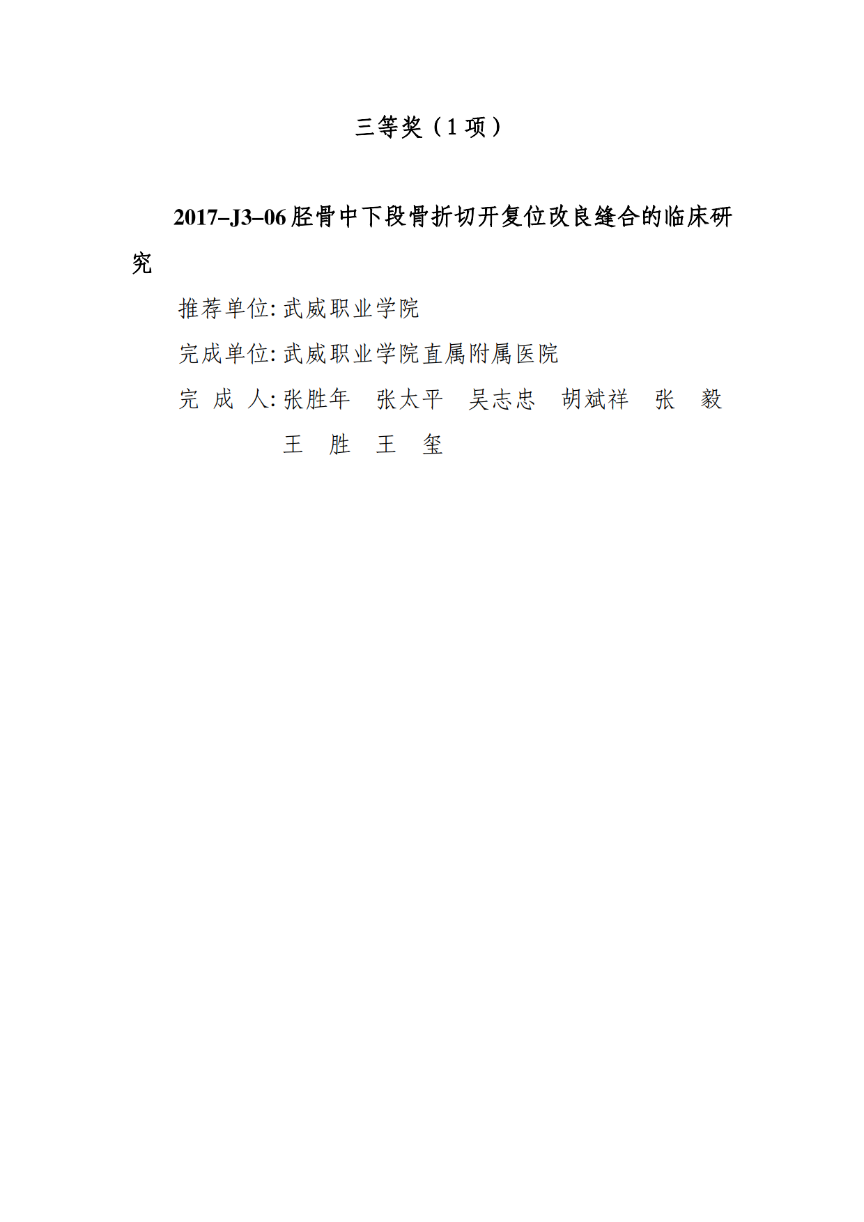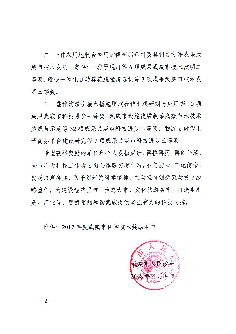 武威市人民政府關(guān)于2017年度武威市科學(xué)技術(shù)獎勵的決定及獎勵名單