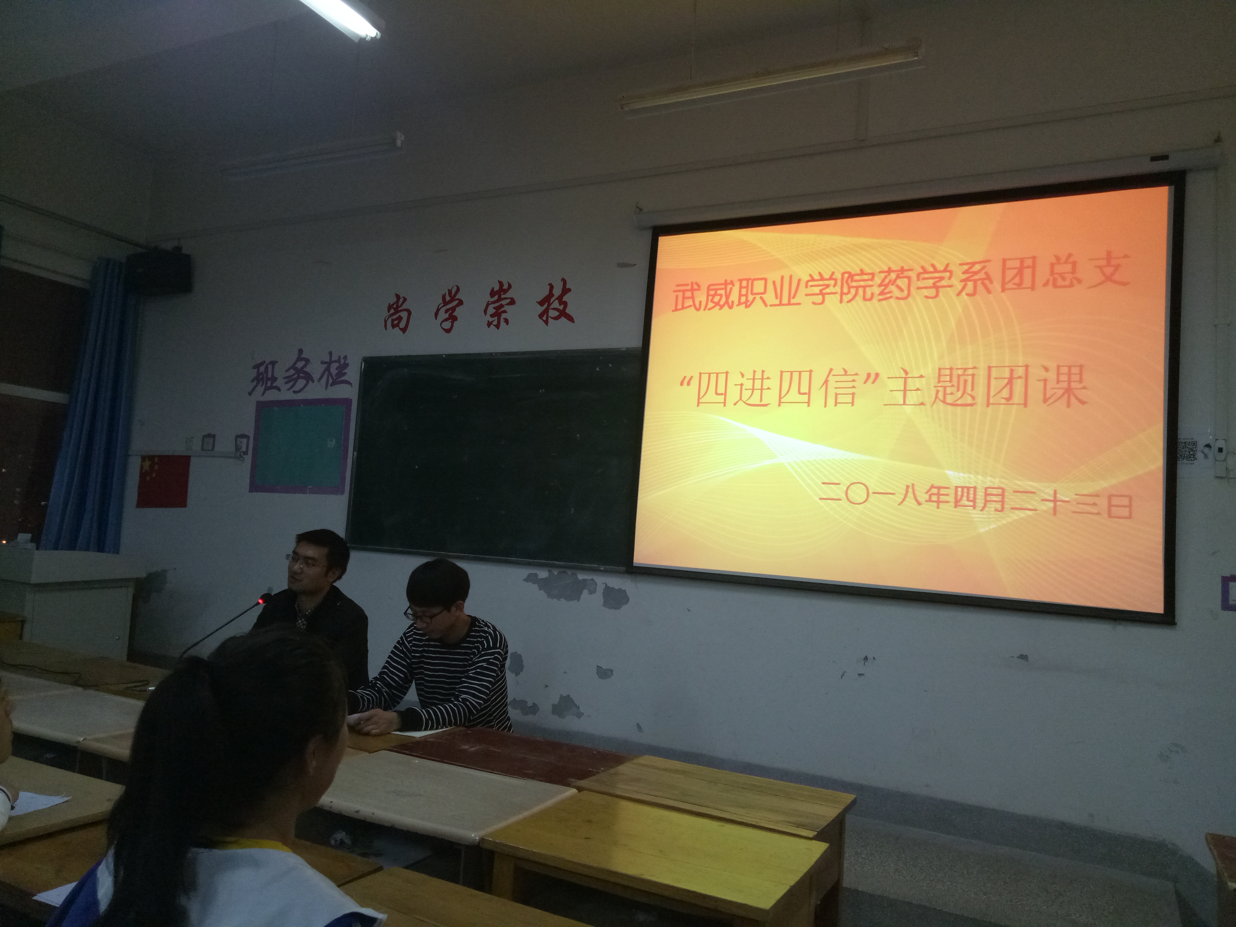 為深入學(xué)習(xí)宣傳貫徹習(xí)近平新時代中國特色社會主義思想,堅持以習(xí)近平新時代中國特色社會主義思想武裝團員干部和團員青年學(xué)生頭腦,積極推進各項工作開展。2018年4月23日晚,藥學(xué)系團總支組織16級團員青年及17級入團積極分子在明遠樓501教室開展關(guān)于“四進四信”的主題團課活動,團課由要藥學(xué)系團總支書記陳輝生主持。