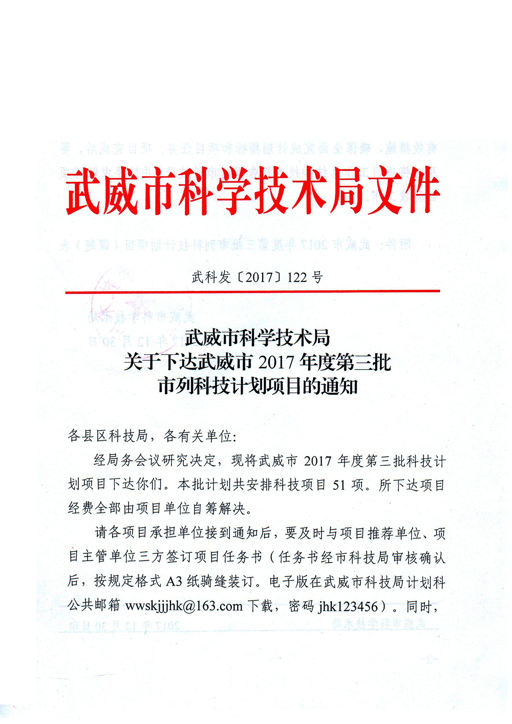 武威市科學(xué)技術(shù)局關(guān)于下達(dá)2016年度武威市第一批科技計劃項目的通知