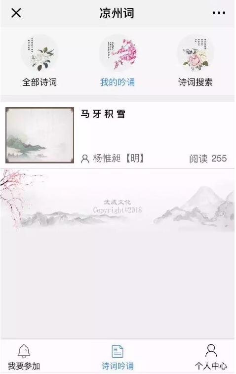 1.打開“武威文化”公眾號(hào),點(diǎn)擊最下方“吟涼州詞”進(jìn)入活動(dòng)“萬(wàn)人吟誦涼州詞”活動(dòng)頁(yè)面。