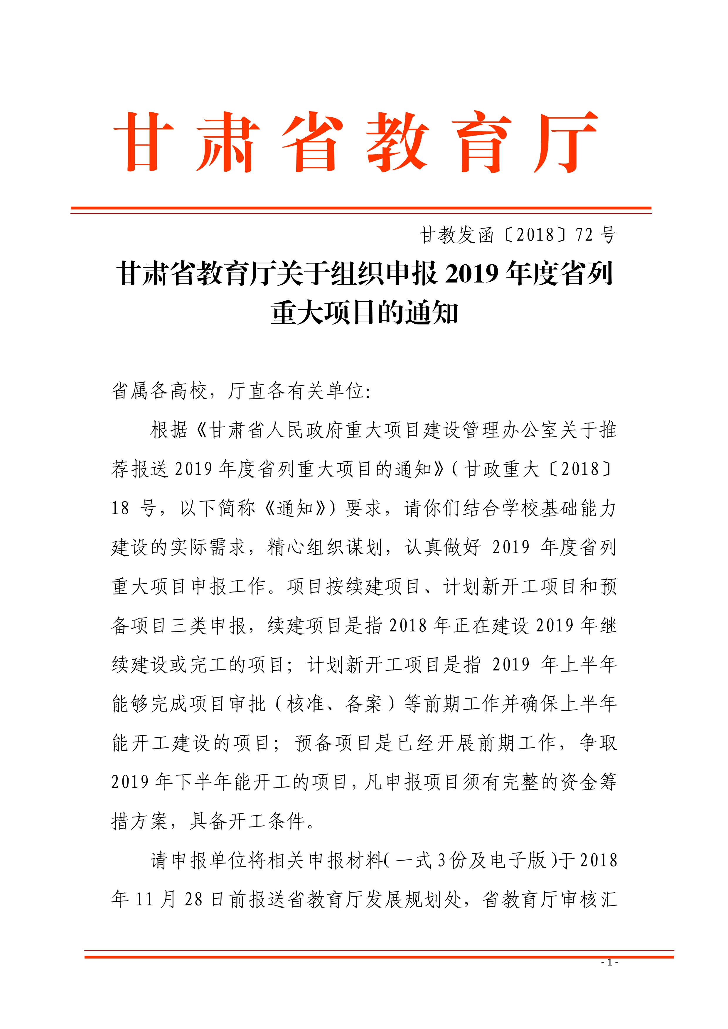 轉(zhuǎn)發(fā)甘肅省教育廳關(guān)于組織申報2019年度省列重大項目的通知