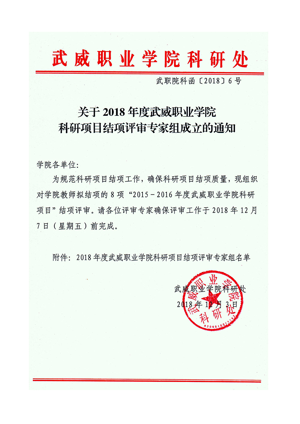 關(guān)于2018年度武威職業(yè)學(xué)院科研項(xiàng)目結(jié)項(xiàng)評(píng)審專(zhuān)家組成立的通知