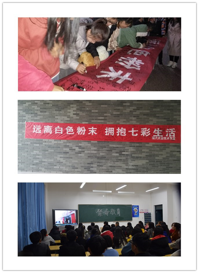 現(xiàn)代農(nóng)業(yè)技術(shù)系結(jié)合自身實(shí)際和條件,重點(diǎn)開展了以下活動(dòng)。一是通過在行樹樓張貼“遠(yuǎn)離白色粉末擁抱七彩生活”禁毒橫幅,號(hào)召全系師生創(chuàng)建和諧、文明、無毒的校園環(huán)境;二是各班開展了禁毒宣傳主題班會(huì),宣傳毒品危害,普及防毒知識(shí),警示大家珍愛生命,遠(yuǎn)離毒品;三是組織學(xué)生參加學(xué)院禁毒征文大賽,用語言表達(dá)禁毒的決心;四是團(tuán)學(xué)會(huì)組織各班同學(xué)網(wǎng)上參觀“中國(guó)禁毒數(shù)字展覽館”,觀看禁毒題材的優(yōu)秀微電影《一路有你》、《少年的秘密》、《蛻變》、《愛心帶你回家》,讓在場(chǎng)同學(xué)深刻感受到毒品的危害,堅(jiān)定了同學(xué)們禁毒防毒的信心。