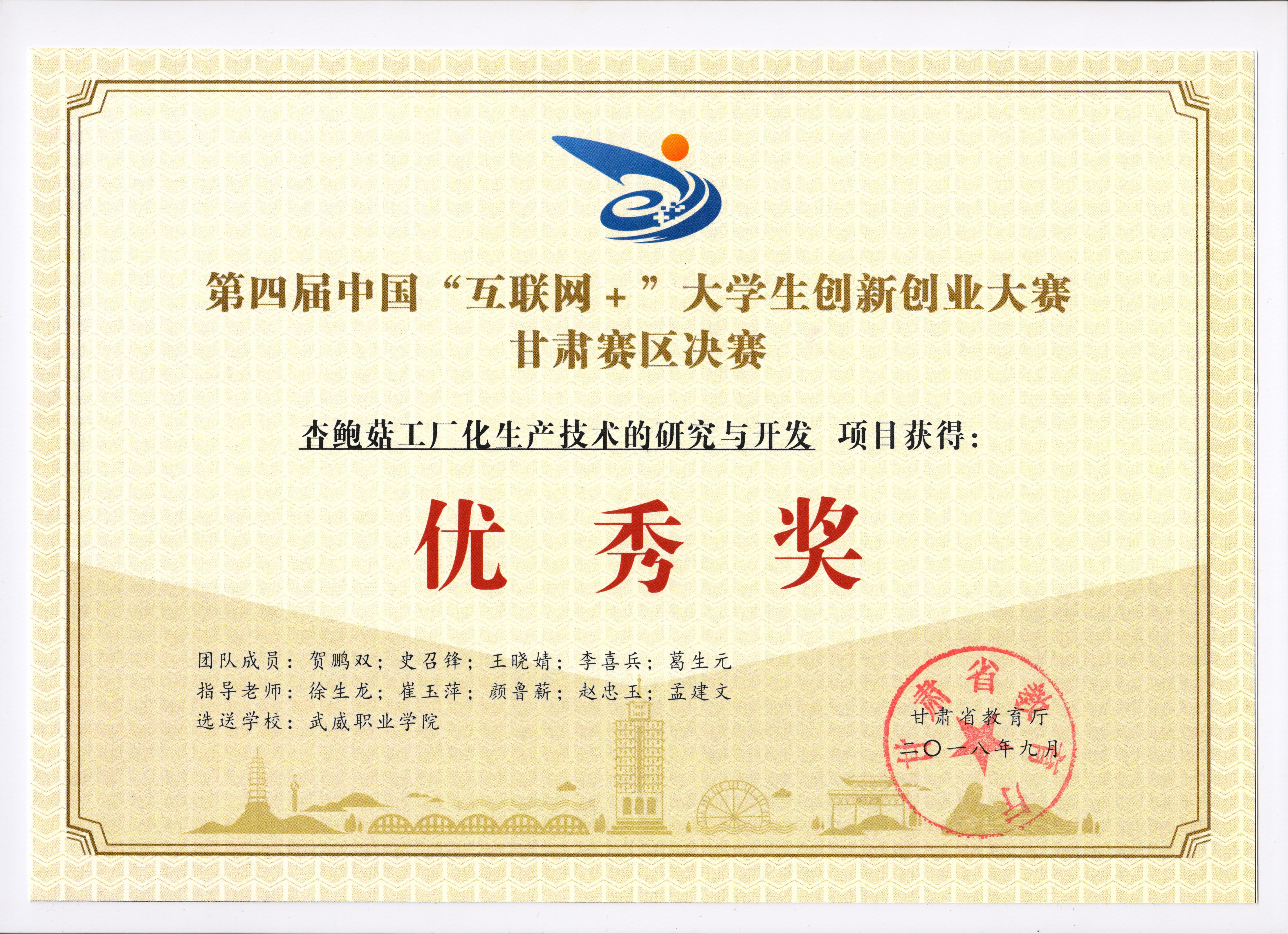 《杏鮑菇工廠化生產(chǎn)技術(shù)的研究與開發(fā)》項目榮獲第四屆中國“互聯(lián)網(wǎng)+”大學(xué)生創(chuàng)新創(chuàng)業(yè)大賽甘肅賽區(qū)優(yōu)秀獎