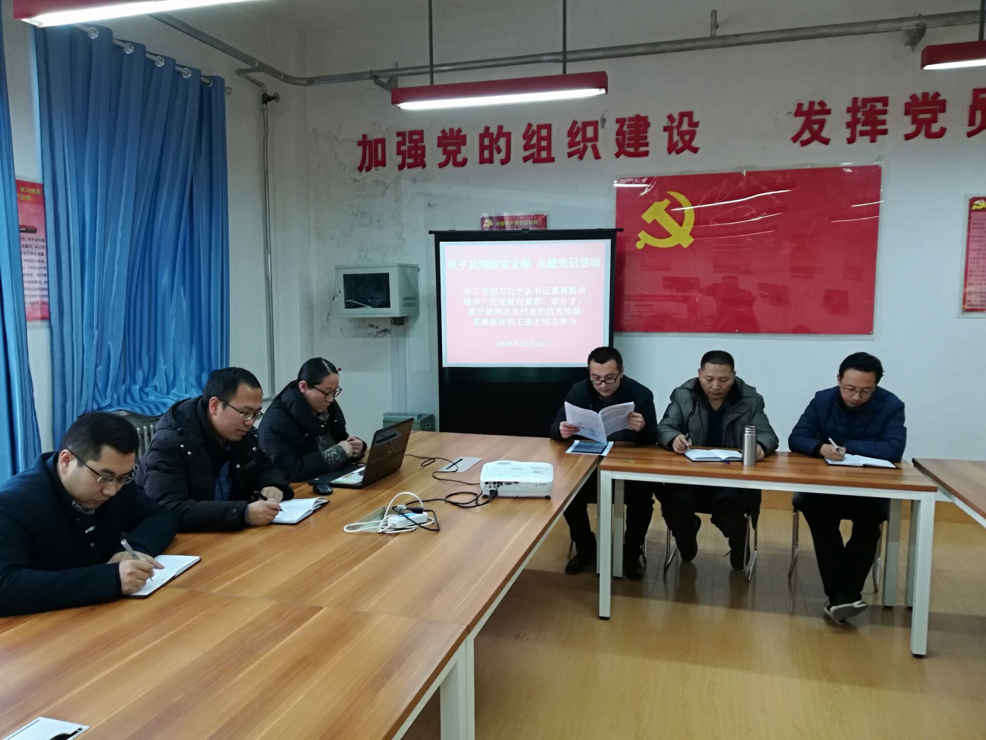 2018年12月21日,電子及網(wǎng)絡(luò)黨支部組織開展“不忘初心、牢記使命——學(xué)習(xí)全國、全省優(yōu)秀共產(chǎn)黨員先進(jìn)事跡”主題黨日活動,電子及網(wǎng)絡(luò)黨支部全體黨員參加學(xué)習(xí)。