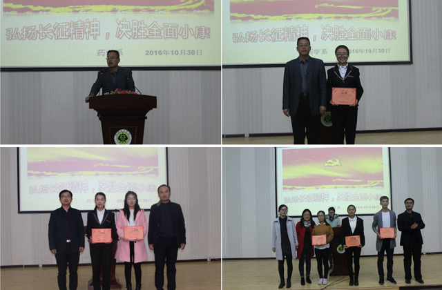 為紀(jì)念紅軍長征勝利80周年,激發(fā)師生弘揚(yáng)偉大的長征精神,同時為豐富校園文化生活,展示青春正能量,藥學(xué)系團(tuán)總支依據(jù)院團(tuán)委的通知精神和系團(tuán)學(xué)工作委員會關(guān)于增加學(xué)生課余活動的會議要求,于10月30日在正德廳組織開展了“傳承長征精神,筑我青春夢想”主題演講比賽。藥學(xué)系主任魏潤明出席了本次活動,各班班主任擔(dān)任本次比賽評委,2016級全體學(xué)生和2015級各班學(xué)生代表觀看了比賽。