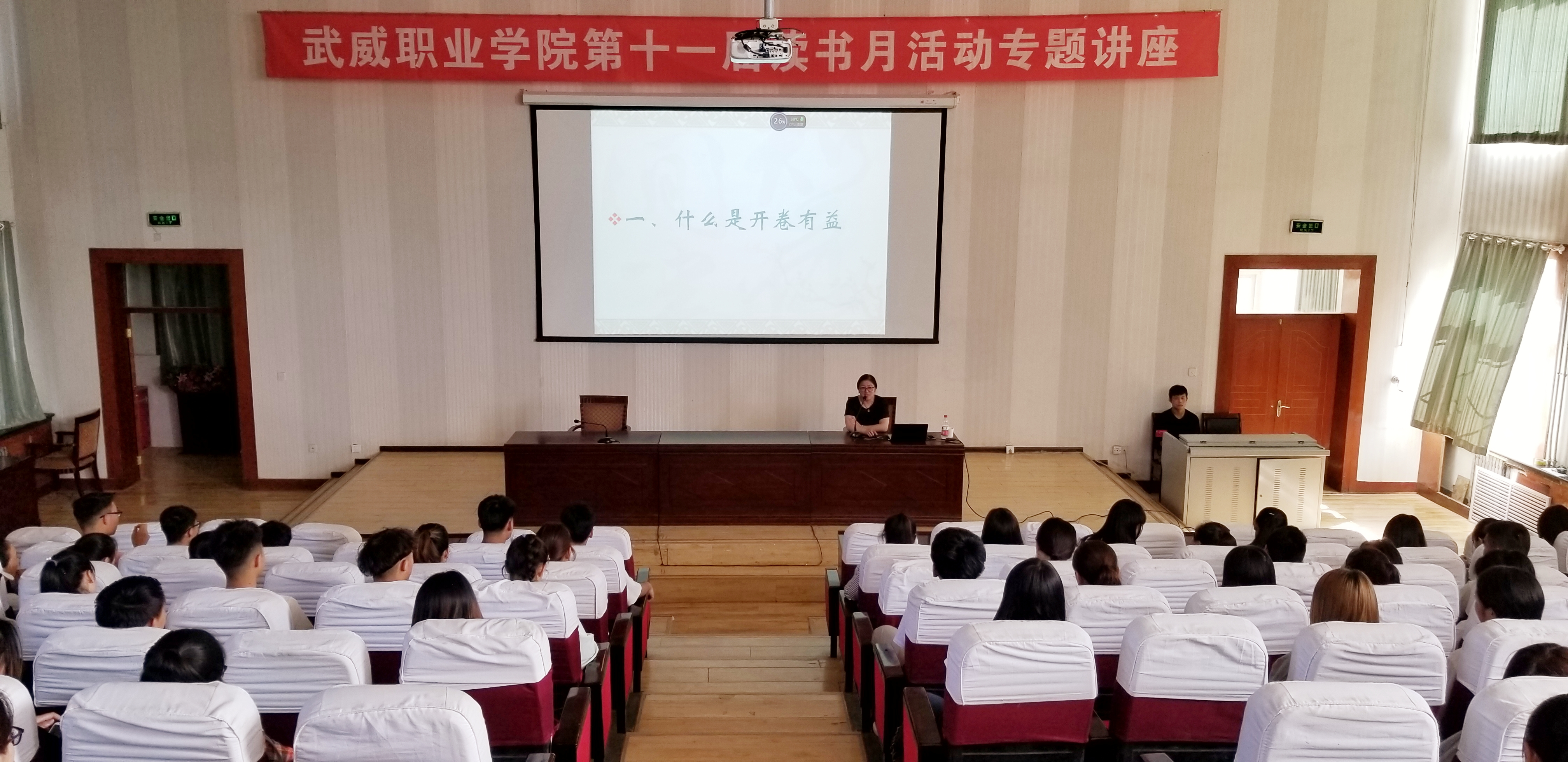武威職業(yè)學(xué)院第十一屆讀書月活動(dòng)專題講座6月12日在正德廳舉行。學(xué)院中文專業(yè)副教授、電子信息工程系主任李亞梅應(yīng)邀進(jìn)行了《開卷有益》讀書月談讀書的專題講座,近300名師生參加了此次講座。
