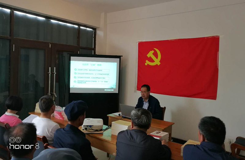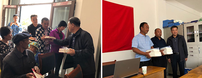課后,學院領導把《習近平新時代中國特色社會主義思想學習綱要》《習近平新時代中國特色社會主義思想三十講》《全國優(yōu)秀共產(chǎn)黨員風采錄》《新時代黨支部規(guī)范化建設工作實用手冊》和“掃黑除惡”知識手冊等14類50多冊黨建書籍分別贈送給蘆草溝村、尚家臺村黨支部和駐村工作隊,還向聽課的村民黨員贈送《習近平的七年知青歲月》等書籍。進村入戶的幫扶干部向幫扶戶村民黨員贈送了黨建書籍。共贈送100多冊價值2700多元黨建書籍和掃黑除惡手冊。