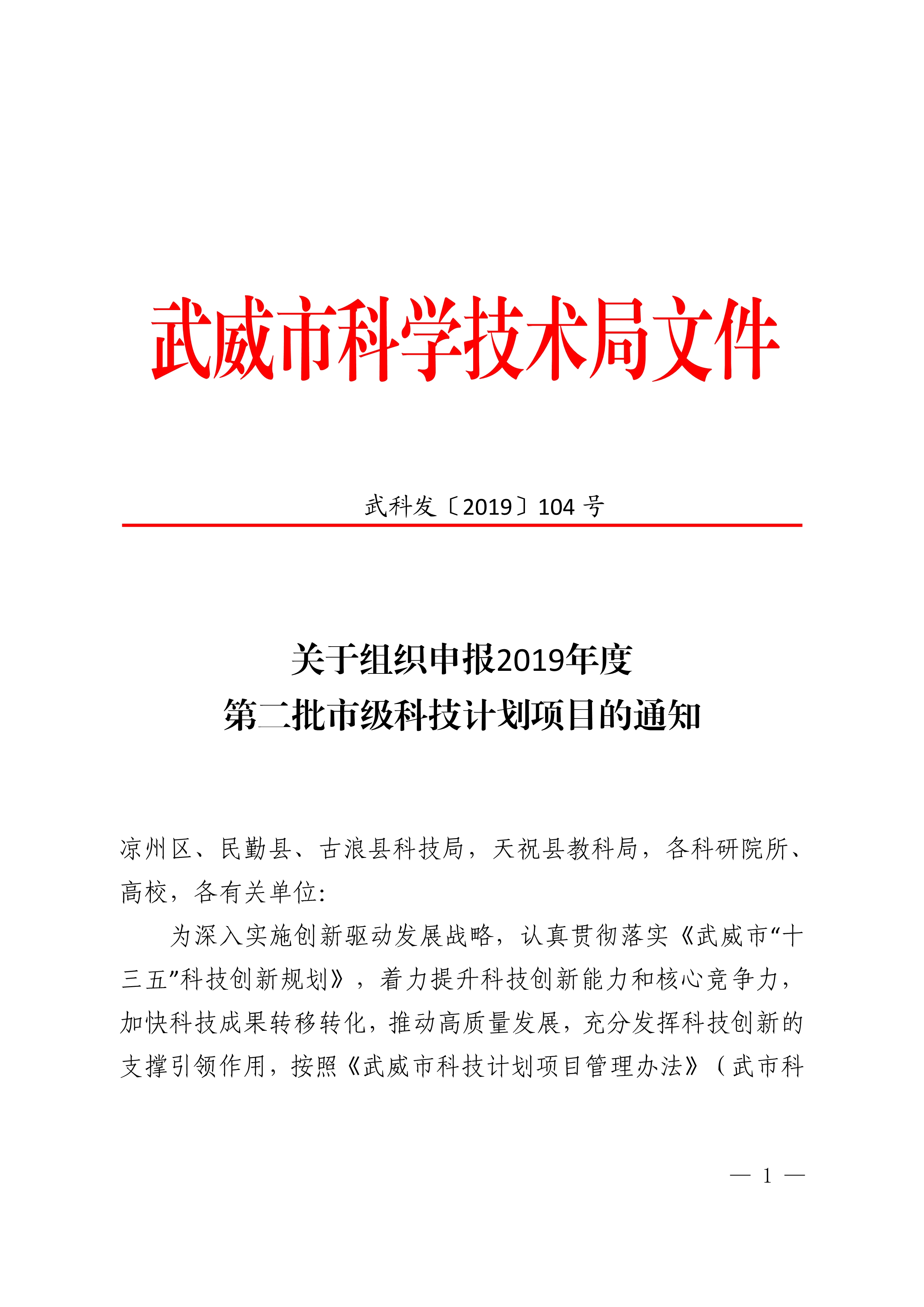 轉(zhuǎn)發(fā)武威市科學(xué)技術(shù)局關(guān)于組織申報2019年度第二批市級科技計劃項目的通知