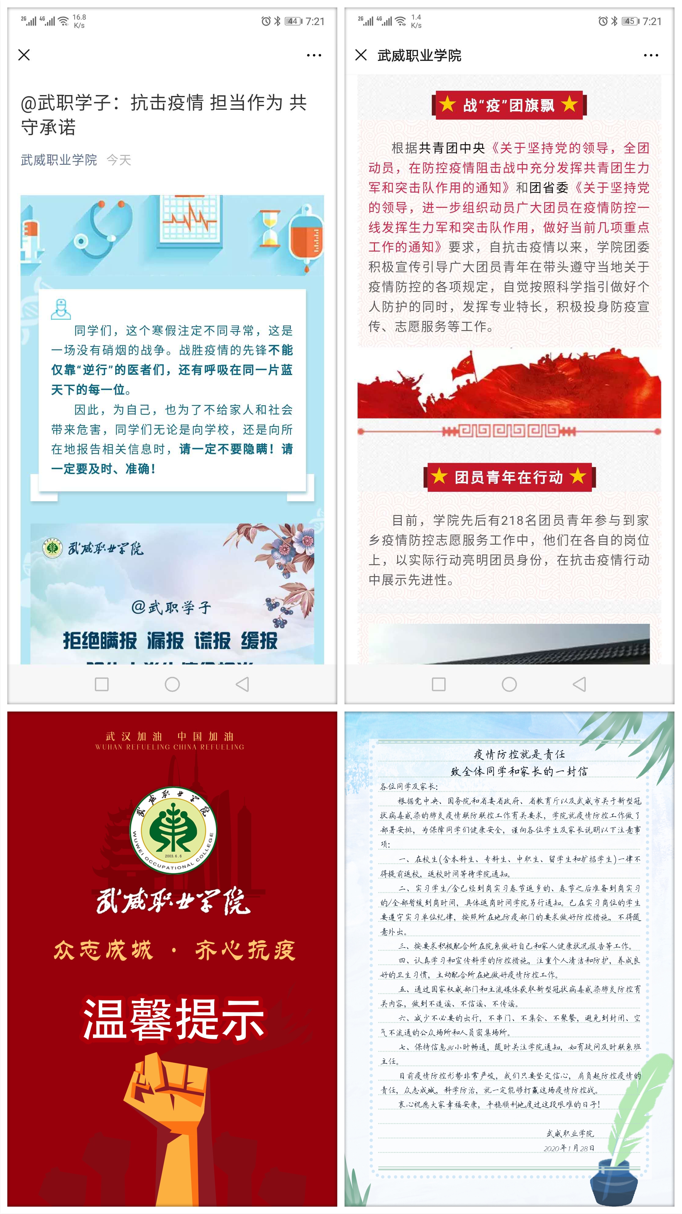 學(xué)生工作處及時(shí)發(fā)布了致學(xué)生和家長(zhǎng)的一封信《疫情防控就是責(zé)任》,團(tuán)委制作和推送了《春暖花開(kāi)疫情散 我們武職再相見(jiàn)》溫馨提示短片和《@武職學(xué)子:抗擊疫情 擔(dān)當(dāng)作為 共守承諾》倡議,用生動(dòng)形象的表述要求和提醒同學(xué)們不得提前返校,做好個(gè)人防護(hù)措施,遵守當(dāng)?shù)匾咔榉揽馗黜?xiàng)要求,做到不信謠不傳謠,及時(shí)向?qū)W院報(bào)送個(gè)人防疫相關(guān)信息,不瞞報(bào)不慌報(bào)。各院系輔導(dǎo)員和班主任都會(huì)第一時(shí)間在學(xué)生群里轉(zhuǎn)發(fā),同時(shí)把學(xué)院網(wǎng)站和微信平臺(tái)上科學(xué)的防控知識(shí)和上級(jí)的有關(guān)精神及時(shí)傳達(dá)給學(xué)生,當(dāng)好疫情防控的宣傳員,做到戰(zhàn)疫有“力”。