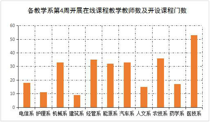 第4周,各教學(xué)系在線課程按照教學(xué)安排全部上線運(yùn)行,實際開課315門,較第1-2周(284門次)有所增加。在線課程達(dá)到“應(yīng)開盡開”的目標(biāo),全部在線課程整體運(yùn)行平穩(wěn)有序。本周授課總學(xué)時達(dá)到1681學(xué)時,教師參加在線授課共計1631人次。