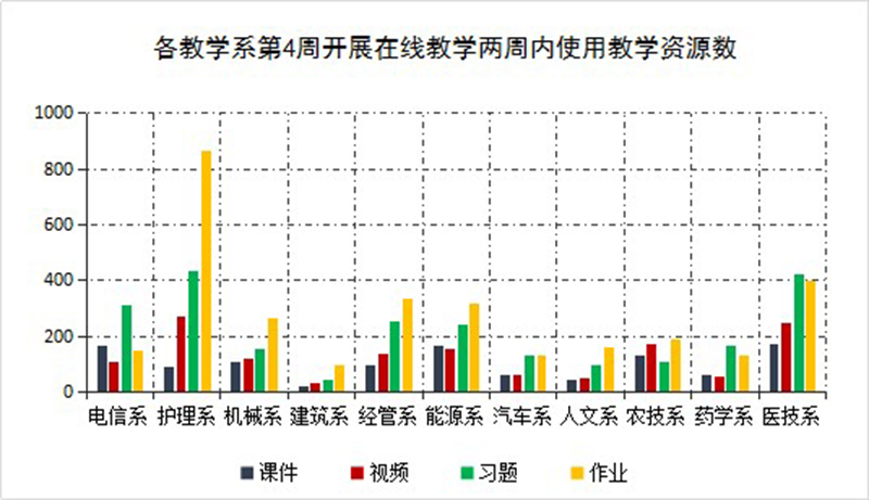 各教學(xué)系全面落實以學(xué)生為中心的教學(xué)理念,充分發(fā)揮班主任、任課教師、學(xué)生干部的監(jiān)督作用,提高在線教學(xué)成效。從各教學(xué)系整體統(tǒng)計數(shù)據(jù)看,第4周,教學(xué)資源學(xué)生訪問量達(dá)到了926633人次,學(xué)生到課127211人次,完成課后作業(yè)638次,上交學(xué)生40512人次。各門課程學(xué)習(xí)任務(wù)完成率普遍有所提高,大多數(shù)課程按照教學(xué)計劃進(jìn)度學(xué)生學(xué)習(xí)完成率已全部達(dá)到100%。
