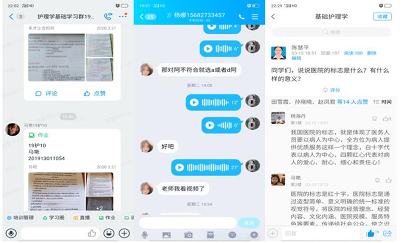 護(hù)理系通過“多平臺、多渠道”全面開展在線教學(xué),主要采取“網(wǎng)絡(luò)課程+資料推送+討論答疑+互動直播”的線上教學(xué)模式。全系24名教師全部實施線上教學(xué),課程共計11門次,已完成授課544學(xué)時(截至3月22日)。本周教師上傳課程課件93件,上傳視頻269個,根據(jù)教學(xué)任務(wù)布置課堂練習(xí)題數(shù)量為435,布置課后作業(yè)題目數(shù)量為857,本周內(nèi)教師組織開展討論、答疑的總次數(shù)為89次,學(xué)生參與答疑討論的次數(shù)為16874次。學(xué)生平均到課率95%以上。從學(xué)院教學(xué)平臺反饋數(shù)據(jù)看,本周課程訪問量達(dá)到399415,位居全院第一。