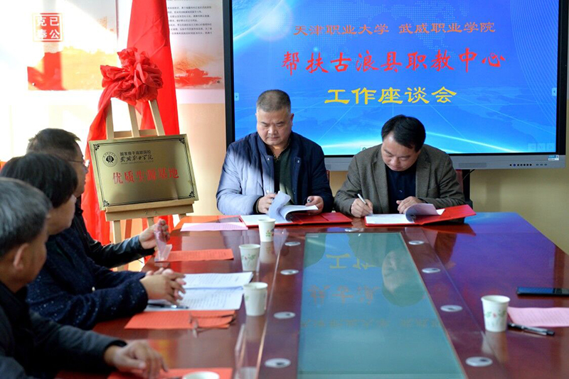 對(duì)接會(huì)上,趙明為古浪職教中心頒授“優(yōu)質(zhì)生源基地”牌匾,簡要介紹了學(xué)院近年來取得的重要辦學(xué)成果。他表示,學(xué)院今年顯著加強(qiáng)了同古浪職教中心的合作力度,今后還要擴(kuò)大合作培養(yǎng)專業(yè),全方位深化合作關(guān)系,共同培養(yǎng)職業(yè)技能人才。他強(qiáng)調(diào),通過兩校的合作辦學(xué),我們要取長補(bǔ)短,促進(jìn)中高職貫通培養(yǎng)大力發(fā)展。會(huì)上,王守云同古浪職教中心校領(lǐng)導(dǎo)簽署了“2020年中高職貫通培養(yǎng)辦學(xué)合作協(xié)議”。