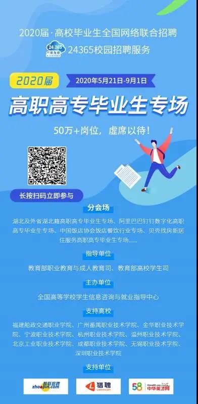 為了進一步促進2020屆高職高專畢業(yè)生就業(yè),教育部高校學生司和職業(yè)教育與成人教育司聯(lián)合推出“高職高專畢業(yè)生專場招聘會”,首批推出崗位超過50萬個。畢業(yè)生可登錄教育部大學生就業(yè)網(wǎng)(新職業(yè)網(wǎng)www.ncss.cn)或直接掃描宣傳頁中的二維碼參與活動。