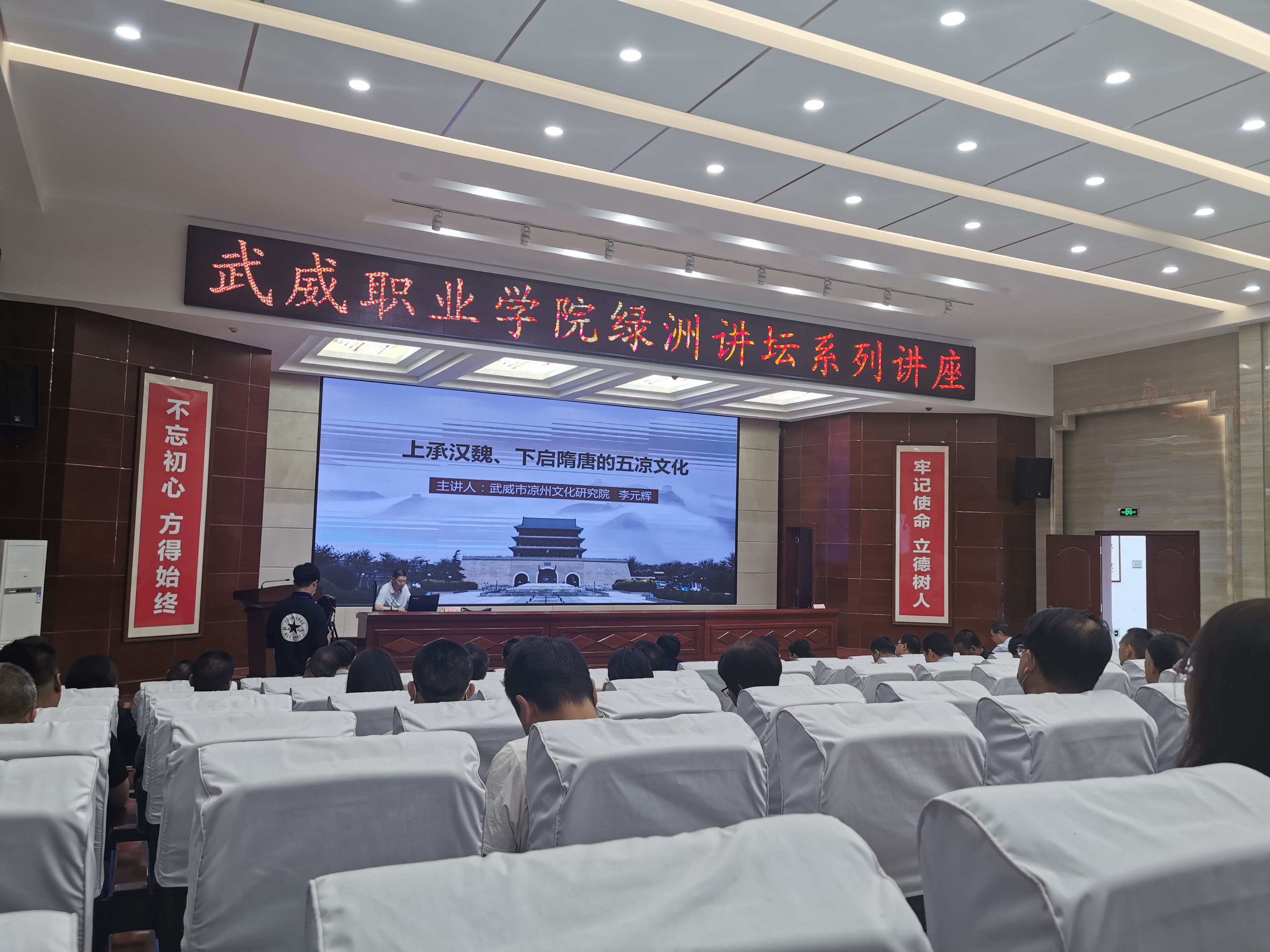 6月12日上午,學(xué)院第34期“綠洲講壇”在菁英廳舉辦,邀請(qǐng)武威市涼州文化研究院研究員、涼州文化研究資深專家李元輝作題為《上承漢魏,下啟隋唐的五涼文化》的專題報(bào)告。蒞臨報(bào)告會(huì)的有涼州文化研究院副院長(zhǎng)王守榮同志,涼州文化研究院文史工作者柴多茂、趙大泰、楊琴琴等同志。學(xué)院領(lǐng)導(dǎo)、中層干部和師生代表共150人聆聽了報(bào)告。報(bào)告會(huì)由學(xué)院黨委副書記翟存祥主持。
