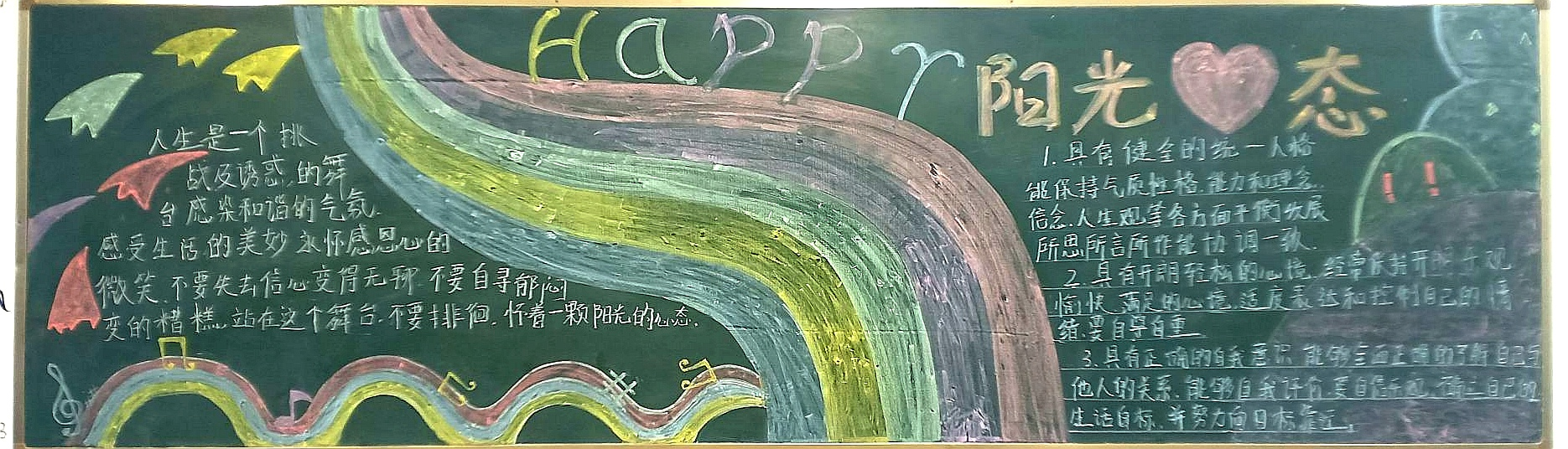 為進(jìn)一步提高大學(xué)生的心理素質(zhì),促進(jìn)大學(xué)生的身心健康和諧,宣傳普及心理健康知識(shí),深入開(kāi)展心理健康教育,我系結(jié)合學(xué)院特點(diǎn),突出專業(yè)優(yōu)勢(shì),在積極承擔(dān)和參與學(xué)校心理健康活動(dòng)月的團(tuán)日活動(dòng)的同時(shí),各班開(kāi)展了豐富多彩的以“心理健康”為主題的黑板報(bào)。