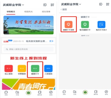 新生使用“智慧校園”賬號,登錄釘釘平臺,進入“武威職業(yè)學院”組織架構(gòu),點擊武職門戶進入新生線上報到流程。