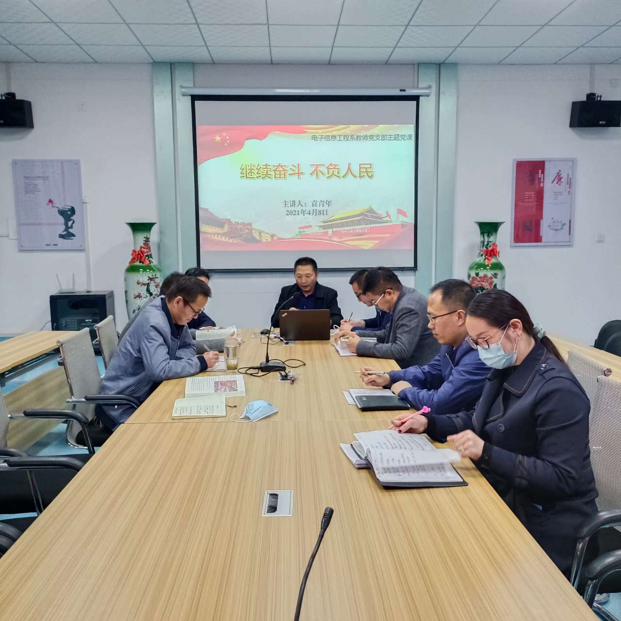 4月8日,電子信息工程系黨總支開展黨總支書記講黨課活動(dòng),全體教師黨員參加了學(xué)習(xí)。電子信息工程系黨總支書記袁青年同志以“繼續(xù)奮斗、不負(fù)人民”主題講了黨課。