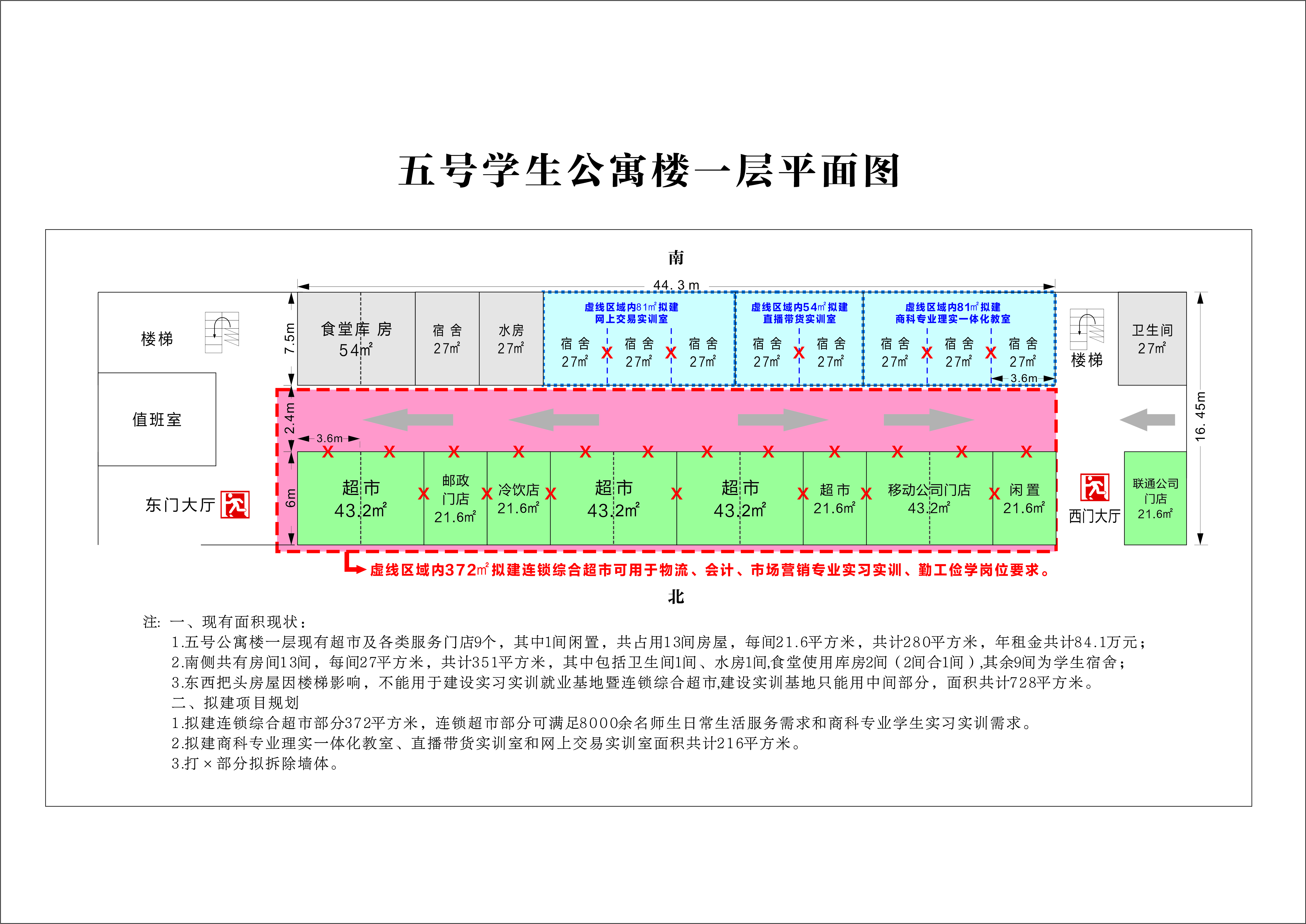 4.學(xué)院提供五號學(xué)生公寓樓一層面積共計(jì)728平方米場地用于建設(shè)學(xué)院商科專業(yè)所需產(chǎn)教融合實(shí)習(xí)實(shí)訓(xùn)就業(yè)基地暨連鎖綜合超市,其中,216平方米用于建設(shè)商科專業(yè)理實(shí)一體化教室、直播帶貨實(shí)訓(xùn)室和網(wǎng)上交易實(shí)訓(xùn)室;372平方米(原商鋪面積為259平方米,增加113平方米為樓道走廊)用于建設(shè)連鎖綜合超市及實(shí)訓(xùn)場所,滿足師生日常生活需求和商科專業(yè)學(xué)生頂崗實(shí)習(xí)、實(shí)訓(xùn)、勤工儉學(xué)等(改建方案詳見附后平面圖)。建設(shè)所需手續(xù)由學(xué)院和企業(yè)雙方配合完成辦理。