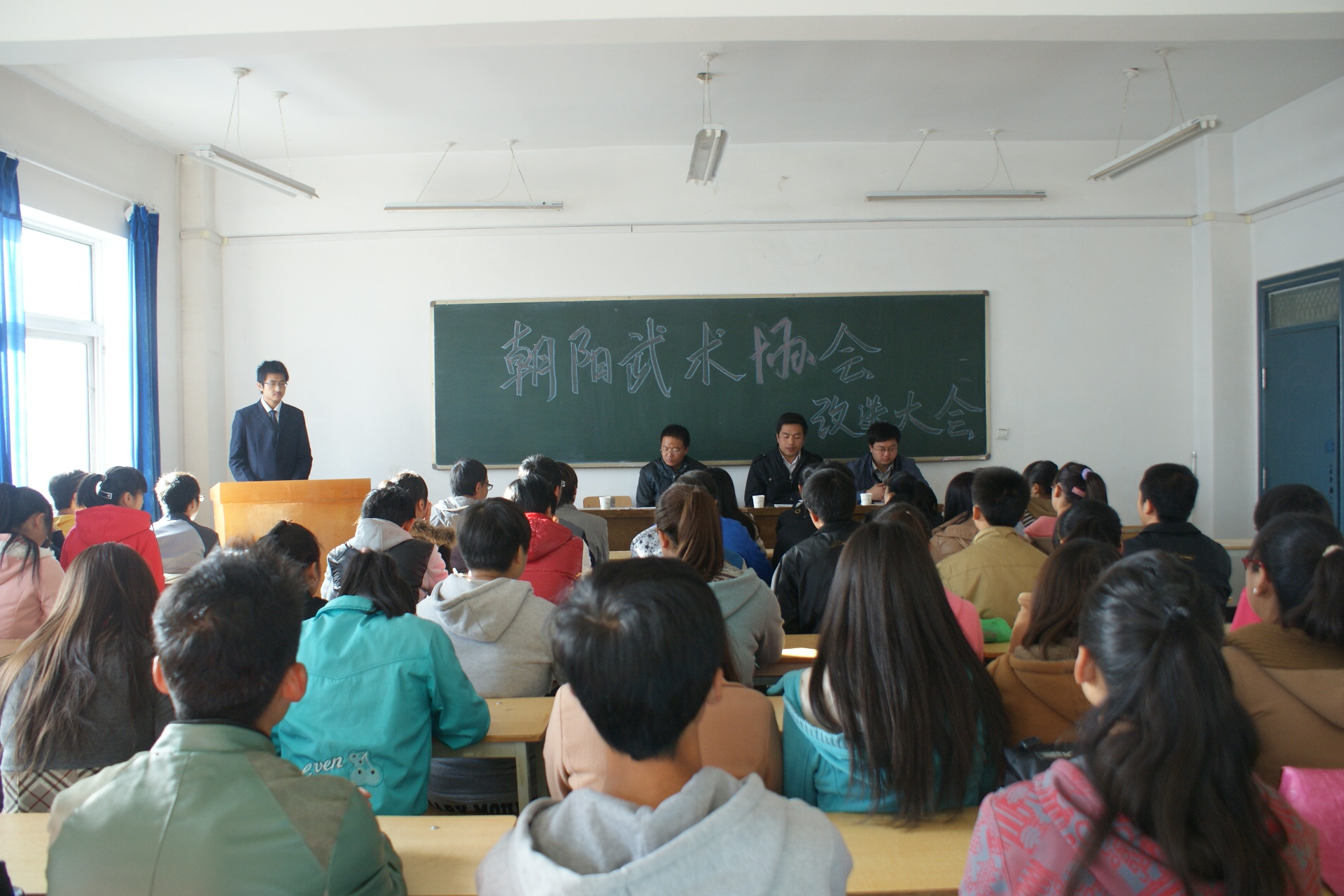為了進(jìn)一步構(gòu)建校園和諧社團(tuán)文化,加強(qiáng)武術(shù)協(xié)會的自身建設(shè),不斷發(fā)展和完善武術(shù)協(xié)會的擴(kuò)招力,激發(fā)優(yōu)秀青年學(xué)生參與協(xié)會建設(shè)的熱情,11日2日上午9時,由朝陽武術(shù)協(xié)會自主承辦的社團(tuán)換屆大會在二號教學(xué)樓316教室如期舉行。
