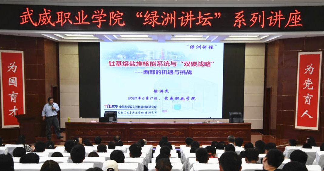 在全院上下深入開展黨史學(xué)習(xí)教育之際,為進(jìn)一步推進(jìn)省級(jí)“雙高計(jì)劃”建設(shè),促進(jìn)中科低碳新能源技術(shù)學(xué)院創(chuàng)新發(fā)展,深化學(xué)院教育教學(xué)改革,6月11日,學(xué)院第45期“綠洲講壇”開講,本次論壇邀請(qǐng)中國(guó)科學(xué)院上海應(yīng)用物理研究所研究員、博士生導(dǎo)師兼中國(guó)科學(xué)院先進(jìn)核能創(chuàng)新研究院院長(zhǎng)徐洪杰為全院師生作題為《基于釷基熔鹽堆的風(fēng)光核儲(chǔ)多能融合系統(tǒng)——西部“雙碳戰(zhàn)略”之路的機(jī)遇和挑戰(zhàn)》的主旨報(bào)告。中國(guó)科學(xué)院上海應(yīng)用物理研究所黨委書記、副所長(zhǎng)趙明華研究員,武威園區(qū)園區(qū)辦主任趙先堂,聯(lián)合辦學(xué)主管兼中科低碳新能源技術(shù)學(xué)院院長(zhǎng)助理米麗娟博士出席,學(xué)院領(lǐng)導(dǎo)班子成員、中層干部、各院系師生代表共220余人參加報(bào)告會(huì)。報(bào)告會(huì)由學(xué)院黨委書記、院長(zhǎng)趙明主持。