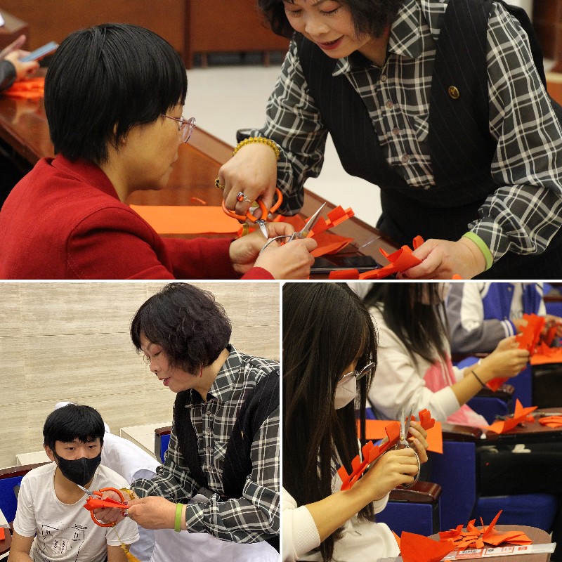 鄭霞從剪紙風(fēng)格、剪紙技巧、剪紙原則等方面深入淺出地介紹了剪紙技藝的基本理論,并為學(xué)校捐贈了2幅剪紙作品,展示了16幅系列作品,得到師生一致好評。講座最吸引人的是動手實操環(huán)節(jié),鄭霞老師親身傳藝,為與會的師生展示了五星、喜字、窗花等的剪法,與會者興致勃勃地參與其中,喜悅與驚呼隨著作品一起迸發(fā)。許多學(xué)生表示,剪紙藝術(shù)很有魅力,愿意跟隨鄭霞老師學(xué)習(xí)技藝,做中華文明的傳承者。