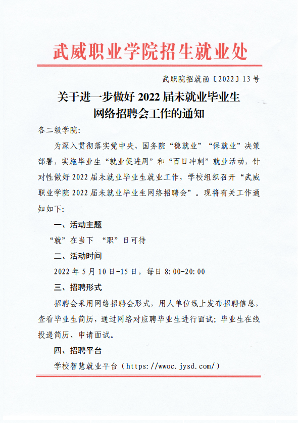 武威職業(yè)學院2022屆未就業(yè)畢業(yè)生就業(yè)促進周暨網(wǎng)絡招聘會邀請函
