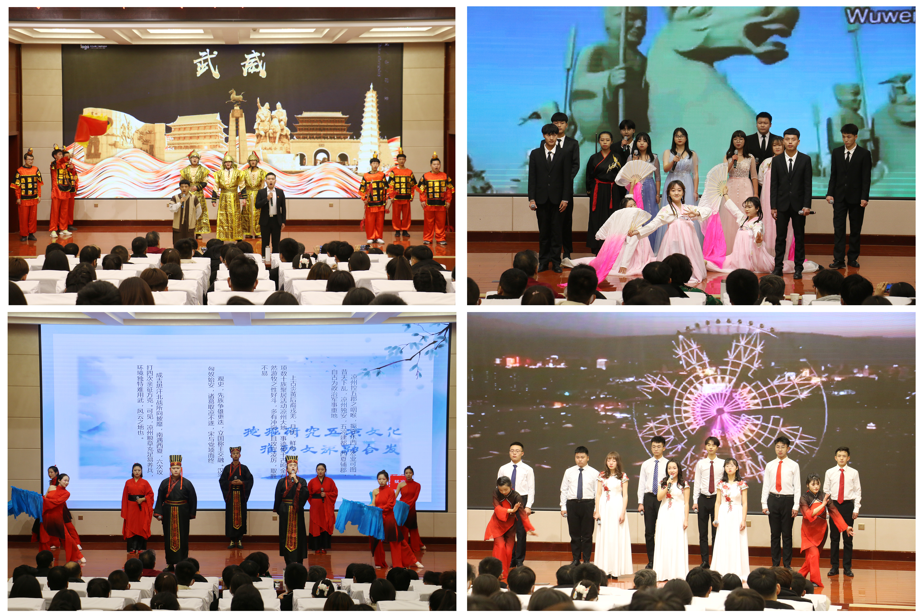 比賽現(xiàn)場精彩紛呈,高潮迭起,來自11個教學(xué)院系推選的節(jié)目匯聚菁英廳,以配樂吟誦、伴舞、書法、武術(shù)、情景劇表演等形式,上演“車馬相交錯,歌吹日縱橫”的涼州遺韻。一首首字正腔圓的吟誦、一場場聲情并茂的演繹,全方位展示了涼州文化深厚的底蘊和鮮明的地域特色。