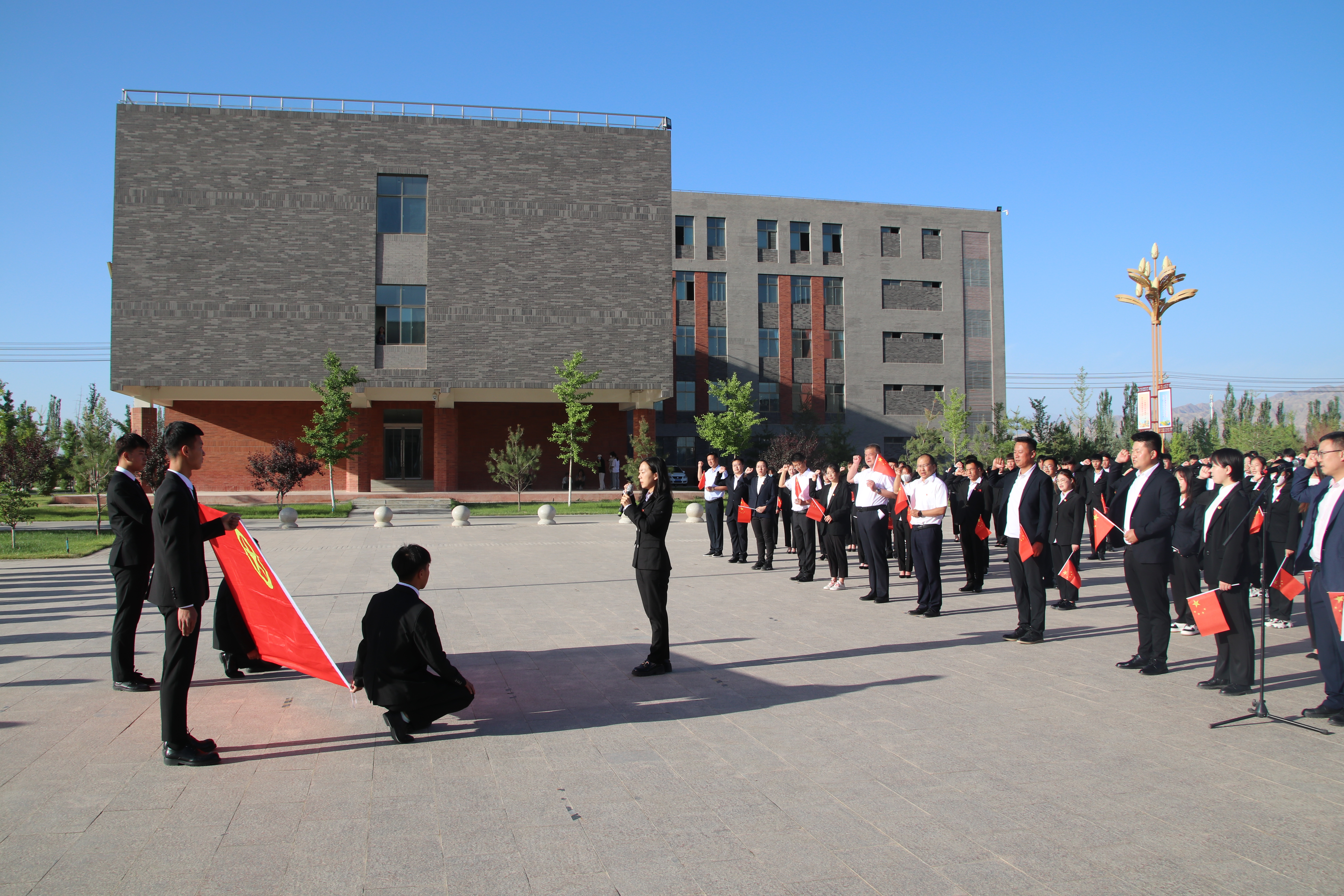 迎著朝陽(yáng),五星紅旗在國(guó)旗護(hù)衛(wèi)隊(duì)的護(hù)送下緩緩入場(chǎng),昂昂國(guó)歌奏響,國(guó)旗迎風(fēng)飄揚(yáng),全場(chǎng)師生齊唱國(guó)歌。學(xué)生代表在國(guó)旗下致獻(xiàn)詞,對(duì)黨許下青春的誓言,獻(xiàn)詞之后舉行了嚴(yán)肅莊重的重溫入團(tuán)誓詞儀式,增強(qiáng)了共青團(tuán)員的組織光榮感和歸屬感,激發(fā)了團(tuán)員青年的使命感和責(zé)任感。最后,全體團(tuán)員青年齊唱《共青團(tuán)團(tuán)歌》,用響亮的歌聲表達(dá)建團(tuán)百年再出發(fā)的祝福,現(xiàn)場(chǎng)愛國(guó)熱情持續(xù)高漲。