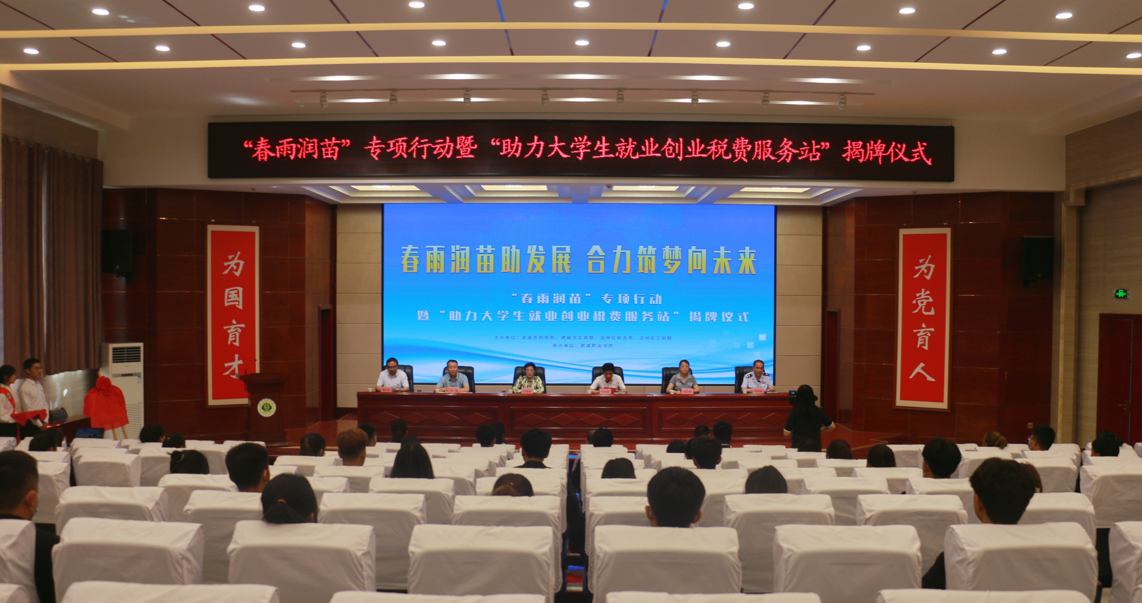 6月10日下午,武威市稅務(wù)局聯(lián)合工商聯(lián)在學(xué)校菁英廳舉辦“春雨潤苗”專項(xiàng)行動(dòng)暨“助力大學(xué)生就業(yè)創(chuàng)業(yè)稅費(fèi)服務(wù)站”揭牌儀式。武威市稅務(wù)局黨委委員、副局長劉永德,武威市工商聯(lián)副主席張連科,涼州區(qū)工商聯(lián)副主席唐紅生,學(xué)校黨委委員、副校長田迎春出席揭牌儀式,涼州區(qū)稅務(wù)局黨委委員、副局長李斌盛主持活動(dòng)。武威市稅務(wù)局黨委委員、副局長劉永德在講話中指出“助力大學(xué)生就業(yè)創(chuàng)業(yè)稅費(fèi)服務(wù)站”的成立,既是武威稅務(wù)部門優(yōu)化稅費(fèi)服務(wù)的有力舉措,也是學(xué)院、工商聯(lián)和稅務(wù)的一次深入合作,更是三方匯聚合力,助力穩(wěn)就業(yè)、保民生、促發(fā)展的積極作為?!?/p>