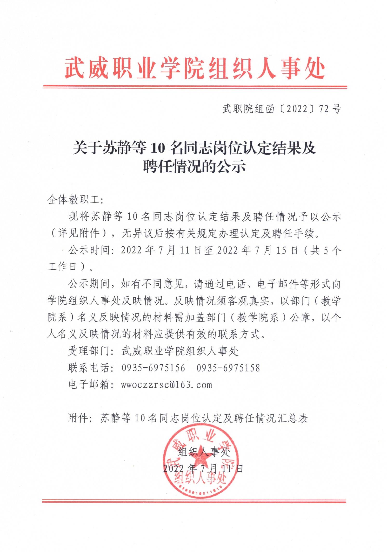 關(guān)于蘇靜等10名同志崗位認(rèn)定結(jié)果及聘任情況的公示