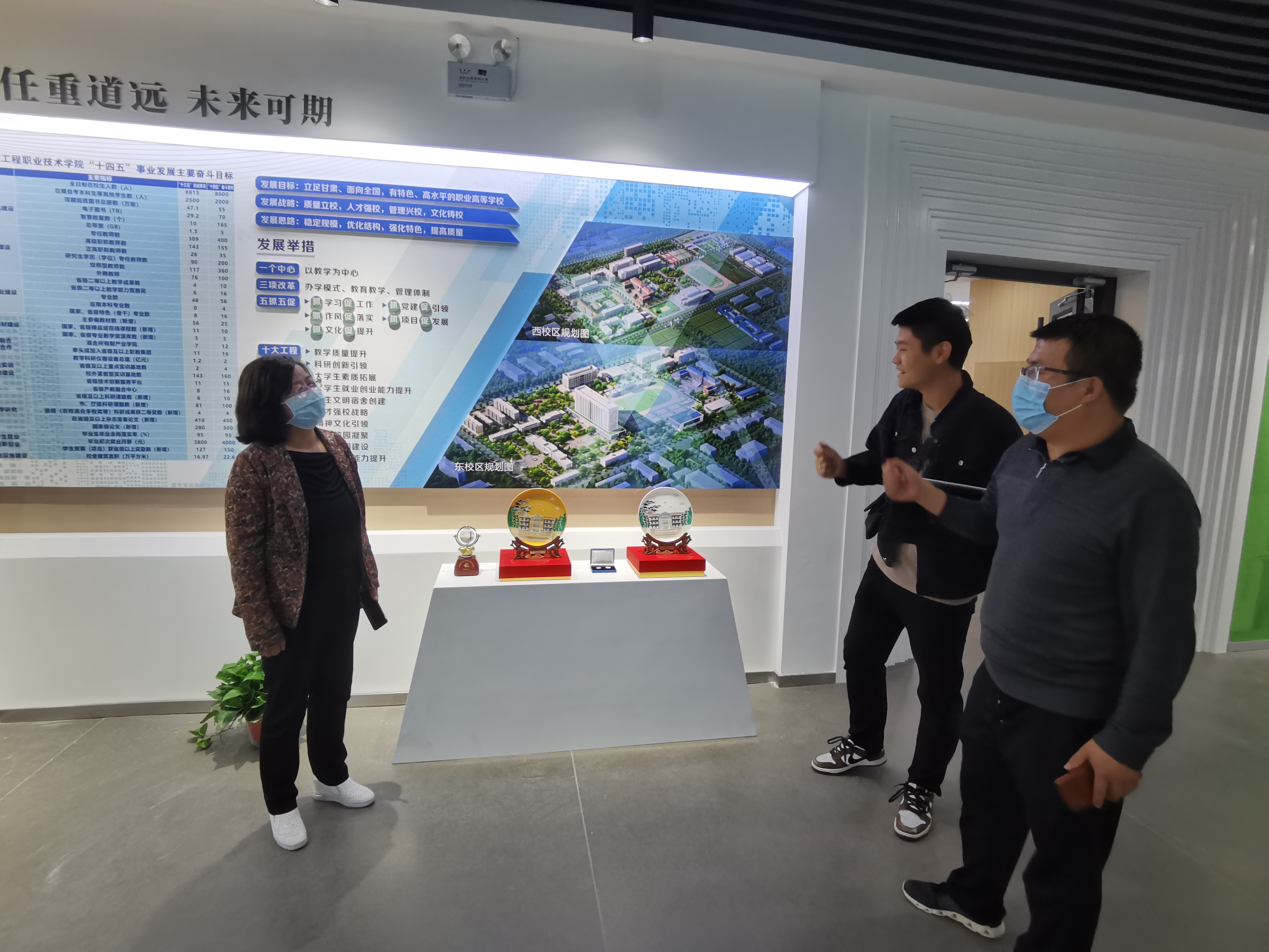 為全面推進(jìn)“雙高計(jì)劃”學(xué)校建設(shè),提升圖書(shū)館服務(wù)水平,營(yíng)造“書(shū)香校園”,將圖書(shū)館打造成人性化、智能化、專(zhuān)業(yè)化的綠色學(xué)習(xí)空間。近日,圖書(shū)館館長(zhǎng)楊如松、副館長(zhǎng)蔡濟(jì)眾、館員楊建盛三人到甘肅省畜牧工程職業(yè)技術(shù)學(xué)院圖書(shū)館考察學(xué)習(xí),在甘肅省畜牧工程職業(yè)技術(shù)學(xué)院圖書(shū)館館長(zhǎng)解玉寶陪同下,參觀了該校圖書(shū)館讀書(shū)吧、校史館、黨史館、“挑戰(zhàn)杯”獲獎(jiǎng)作品展覽館等處,解玉寶講解了該館設(shè)計(jì)理念及建設(shè)過(guò)程中的側(cè)重點(diǎn)和展示重點(diǎn)。楊如松就現(xiàn)在圖書(shū)館裝發(fā)展趨勢(shì)、圖書(shū)館管理辦法、學(xué)生借閱量等實(shí)際問(wèn)題同解玉寶進(jìn)行了相互交流。