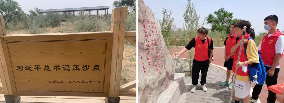 在兩山實踐基地負責人的指引下,我們參觀了習近平總書記曾經(jīng)到達過八步沙參與壓沙的目的地,認真學習了習近平總書記在八步沙的講話精神,深刻領(lǐng)悟到了習近平總書記號召大家要弘揚八步沙“六老漢”困難面前不低頭,敢把沙漠變綠洲的當代愚公精神,在今后,我們將把這種精融入到實踐當中,不負青春,不負韶華積極投身于祖國建設中。
