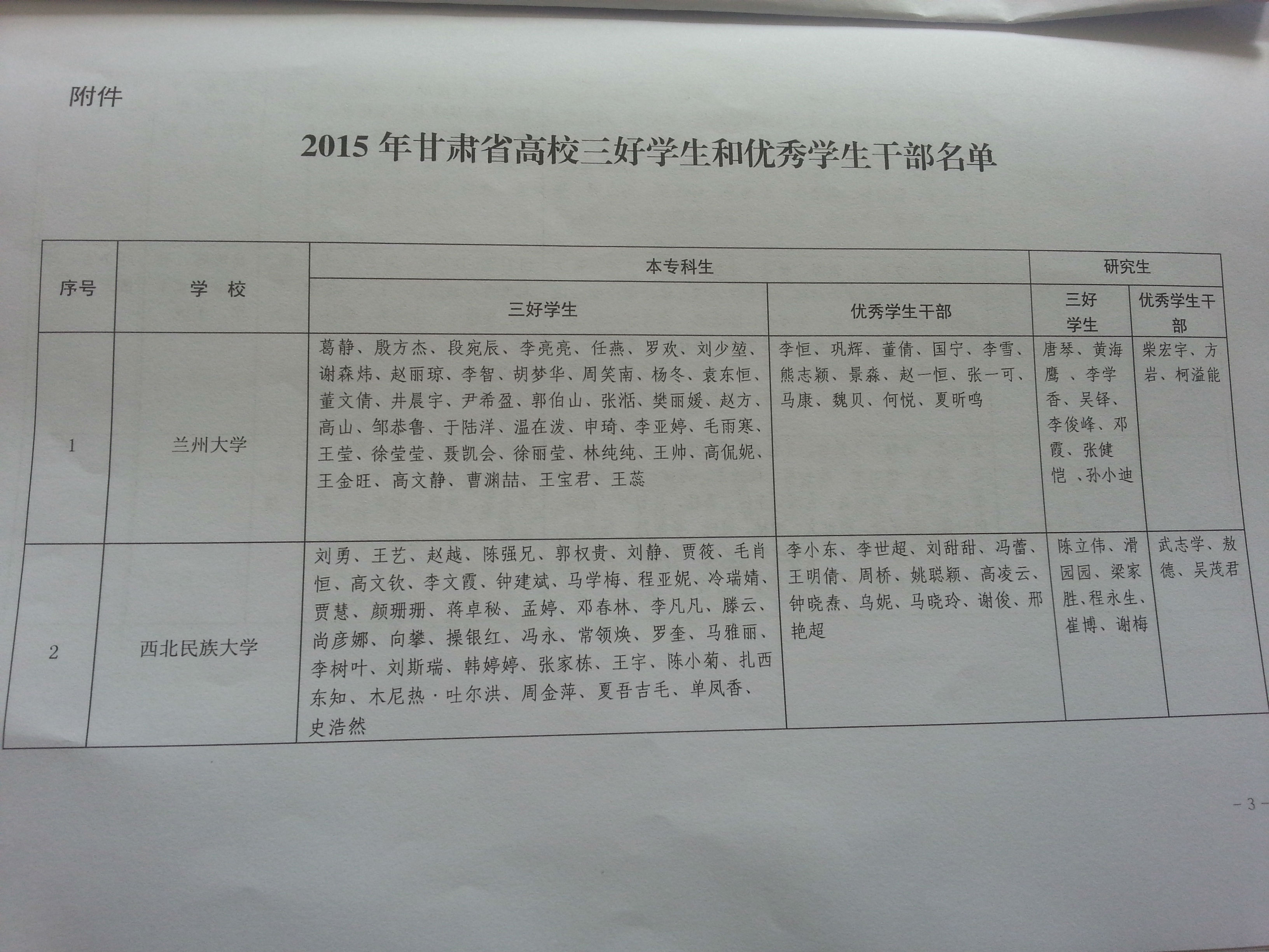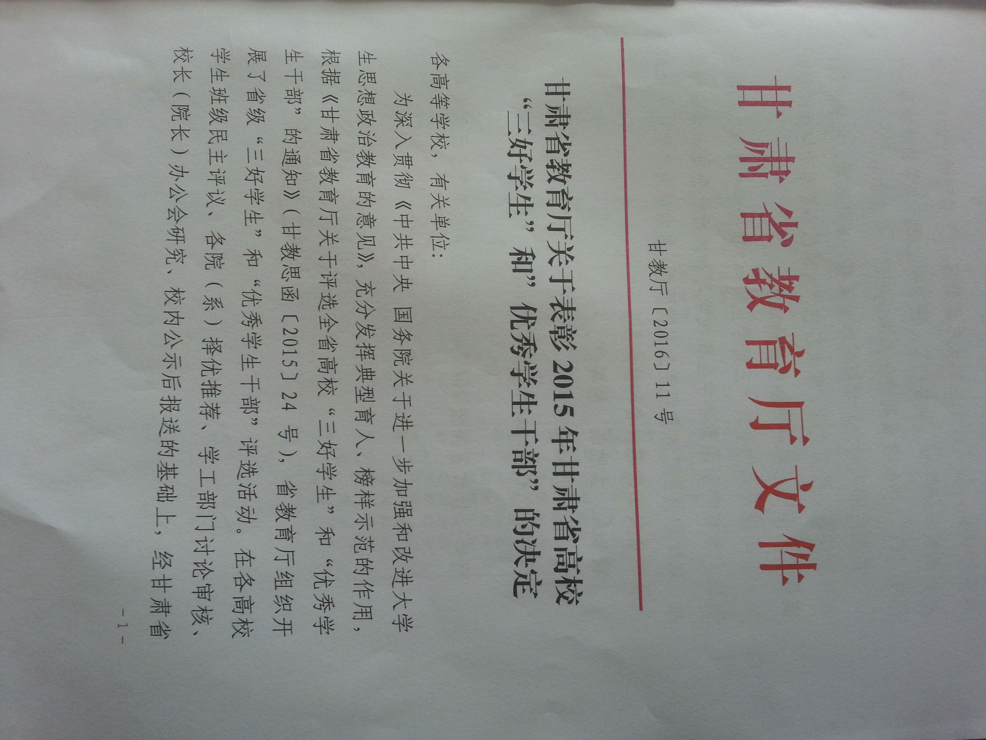 甘肅省教育廳關(guān)于表彰2015年甘肅省高?!叭脤W(xué)生”和“優(yōu)秀學(xué)生干部”的決定
