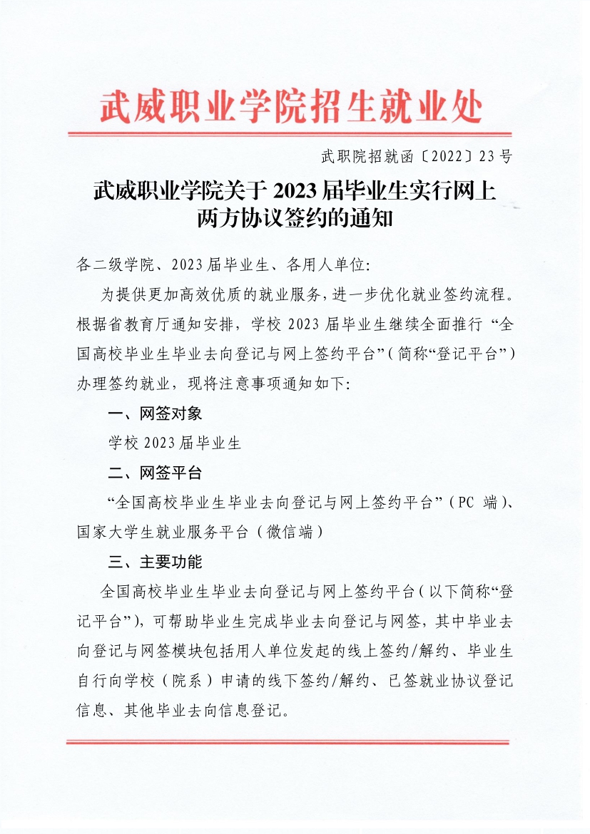 武威職業(yè)學院關于2023屆畢業(yè)生實行網(wǎng)上兩方協(xié)議簽約的通知