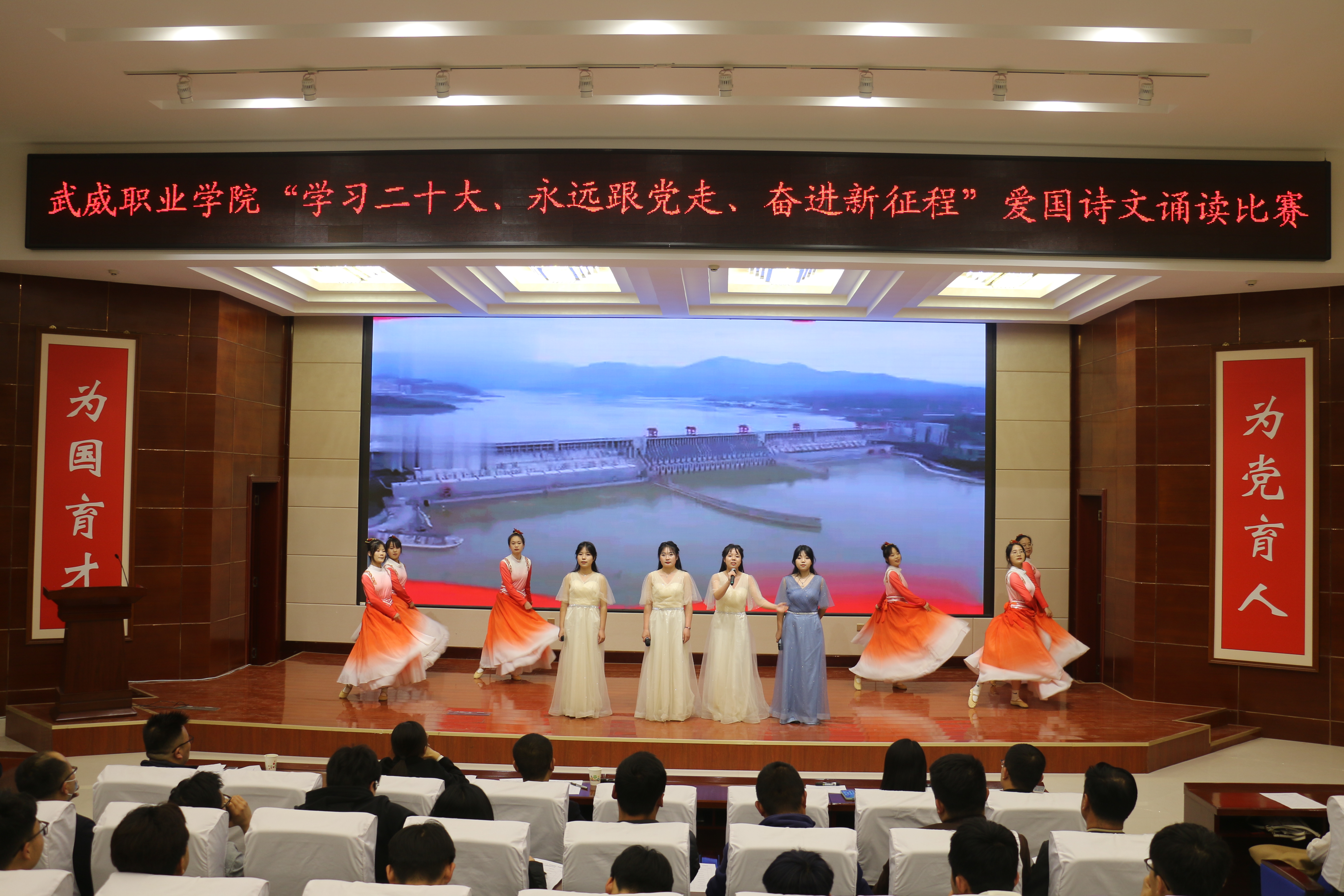 大賽于3月啟動,歷時一個月,各二級學(xué)院經(jīng)過初賽評比推選出9個優(yōu)秀節(jié)目入圍決賽。比賽現(xiàn)場,各參賽隊以“學(xué)習(xí)二十大、永遠跟黨走、奮進新征程”為主題,將傳承經(jīng)典詩文和弘揚愛國主義精神結(jié)合,誦詩抒情、借詞言志,熱情謳歌中國共產(chǎn)黨不懈奮斗的光輝歷程,全面展現(xiàn)新時代青年以夢為馬,不負韶華的青春風(fēng)貌。校團委原創(chuàng)編排表演的節(jié)目《追夢八步沙,奮斗正青春》,深情動人,感染全場,歌頌了“六老漢”矢志艱苦奮斗的隴人品格,抒發(fā)了當(dāng)代青年永跟黨走,青春建功的豪情壯志。富余藝術(shù)感染力的經(jīng)典吟誦,穿插舞蹈、劇情和紅歌演唱,為廣大師生呈現(xiàn)了一場視聽盛宴。