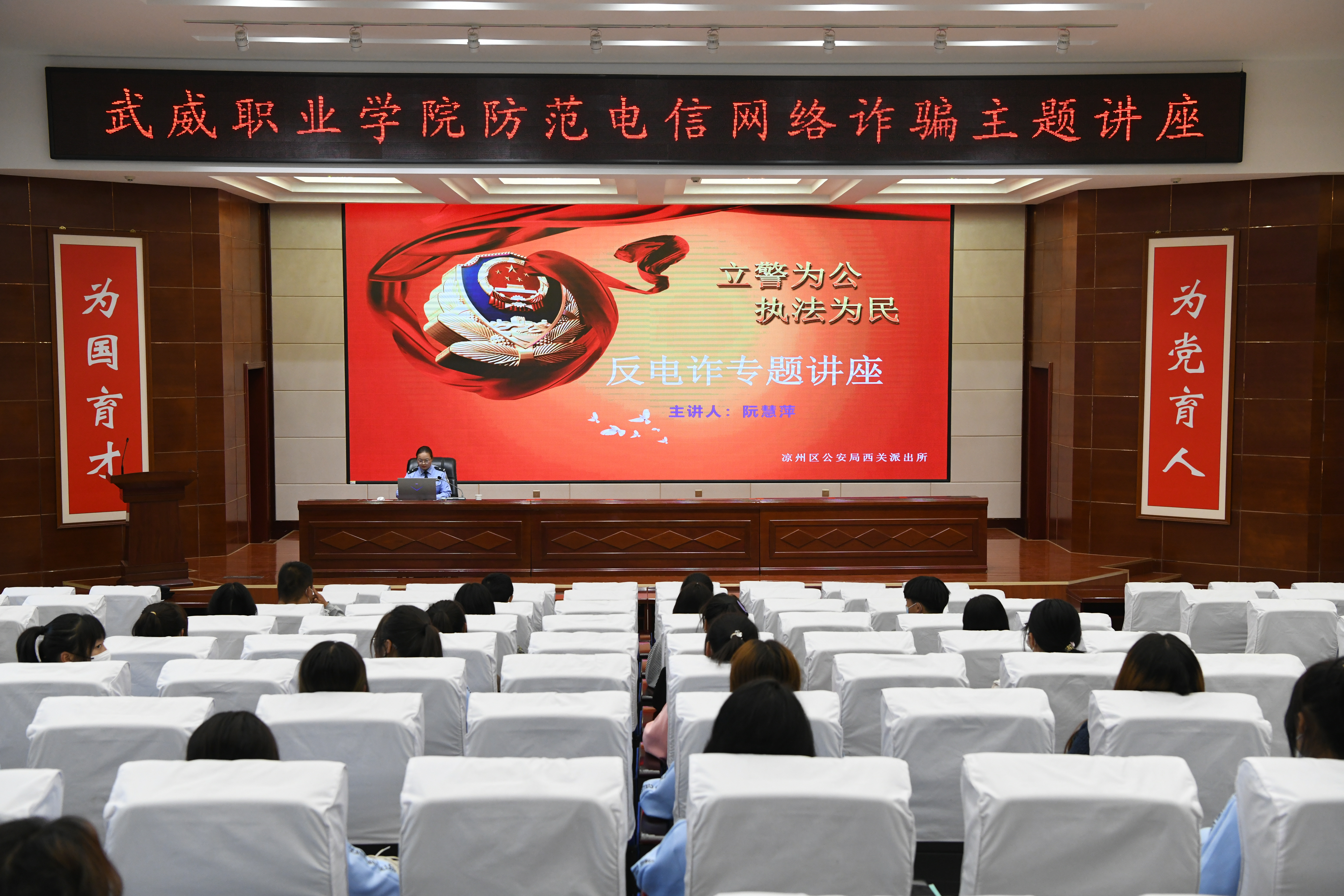 為了提高學校師生識別和防范電信網(wǎng)絡詐騙的能力,切實做好防范電信網(wǎng)絡詐騙宣傳教育工作。9月30日,學校聯(lián)合武威市公安局涼州分局西關派出所在學生發(fā)展中心菁英廳舉辦防范電信網(wǎng)絡詐騙專題講座。各二級學院師生代表聆聽了講座,講座由安全保衛(wèi)處負責人李欣主持。