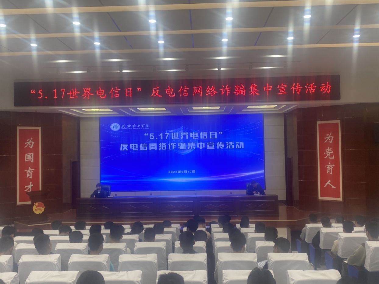 5月17日是世界電信日,為推動防范電信網(wǎng)絡詐騙宣傳教育深入開展,進一步增強師生識詐防詐意識。5月17日下午,安全保衛(wèi)處邀請涼州區(qū)西大街派出所干警和中國建設銀行涼州區(qū)海藏路支行工作人員在學校菁英廳開展了防范電信網(wǎng)絡詐騙專題宣傳教育活動,各二級學院輔導員、在校各教學班班長參加活動。