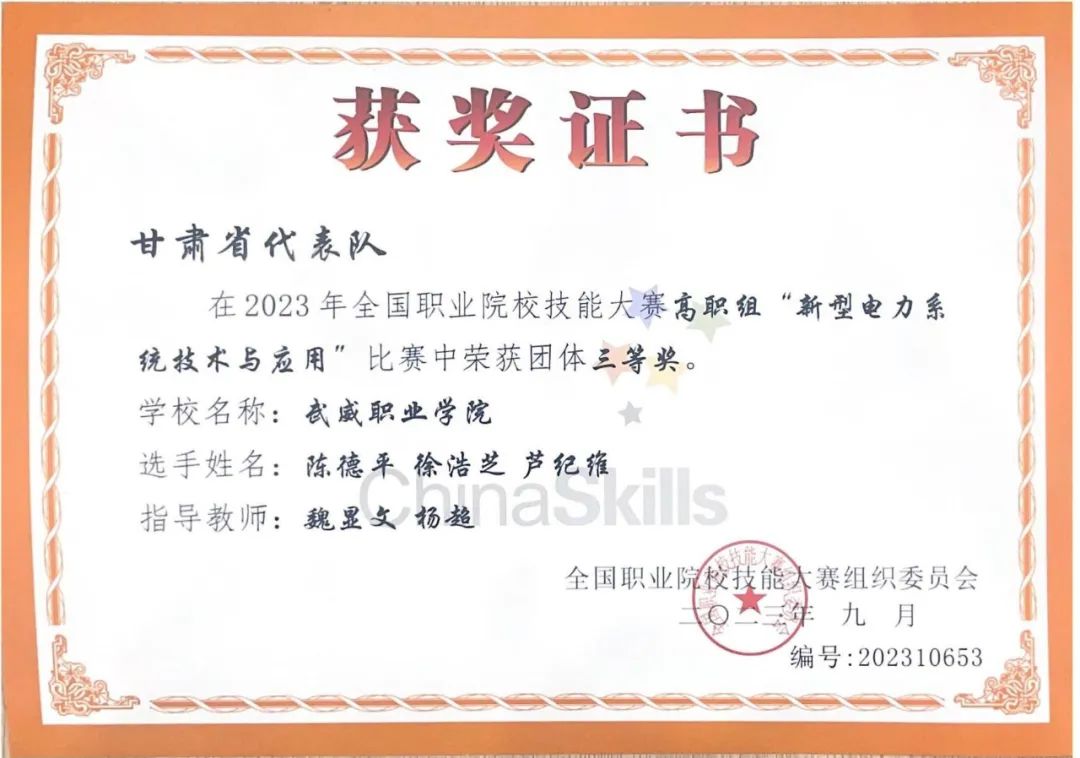 在2023年全國職業(yè)院校技能大賽中中科低碳新能源技術(shù)學(xué)院學(xué)生陳德平、徐浩芝、蘆紀(jì)維獲得高職組新型電力系統(tǒng)技術(shù)與應(yīng)用賽項(xiàng)團(tuán)體三等獎(jiǎng)。