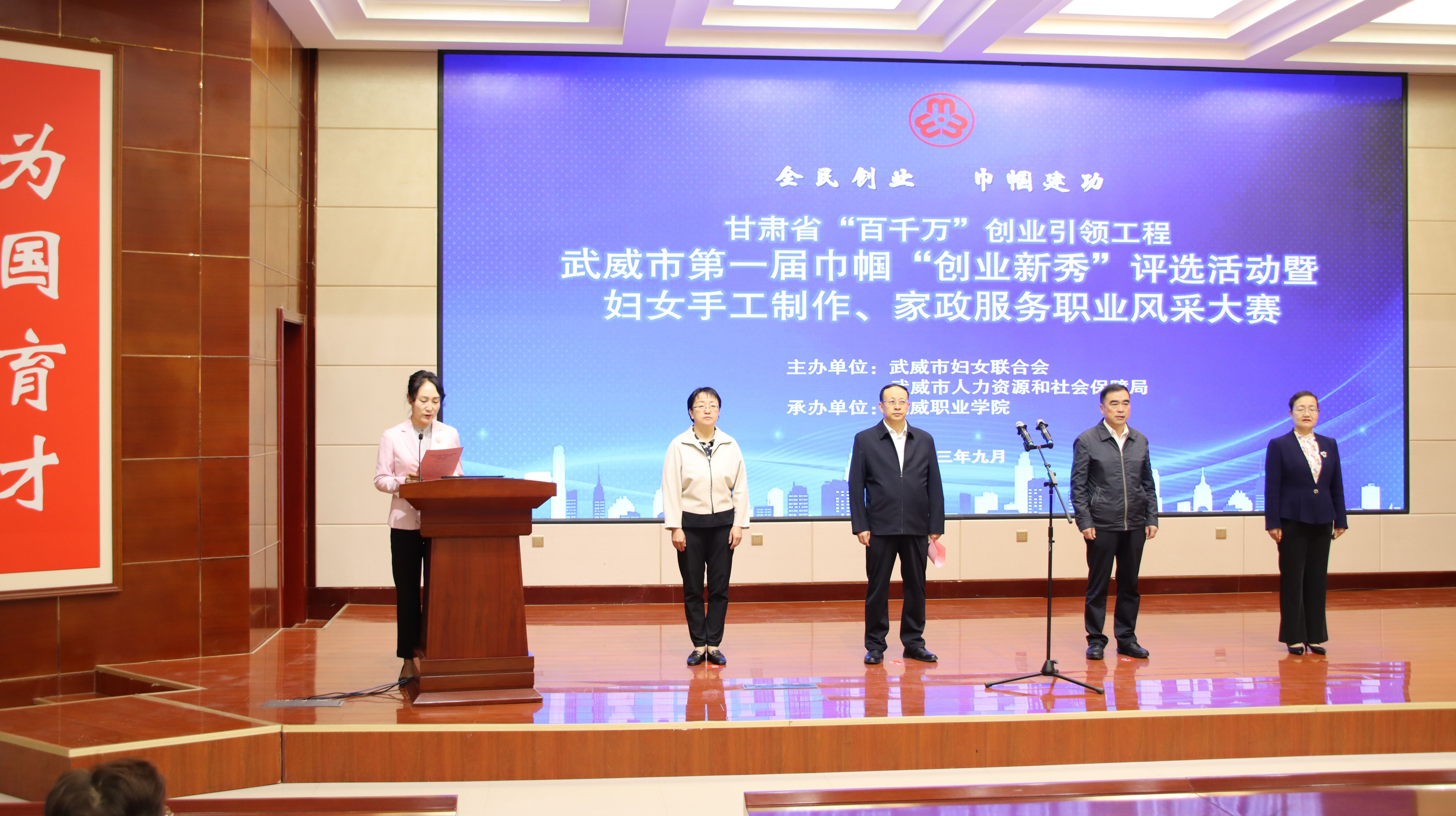 9 月 27 日,由市婦聯(lián)、市人社局主辦、我校承辦的甘肅省“百千萬”創(chuàng)業(yè)引領(lǐng)工程武威市第一屆巾幗“創(chuàng)業(yè)新秀”評選活動暨婦女手工制作、家政服務(wù)職業(yè)風(fēng)采大賽成功舉辦,武威市人社局黨組書記,局長陳昱川,市婦聯(lián)黨組書記,主席劉玉華,武威市就業(yè)局局長魏斌,武威市婦聯(lián)副主席張惠華,縣區(qū)婦聯(lián)負(fù)責(zé)同志,學(xué)校黨委委員,副校長田迎春出席本次活動,參賽選手等100 人參加大賽。