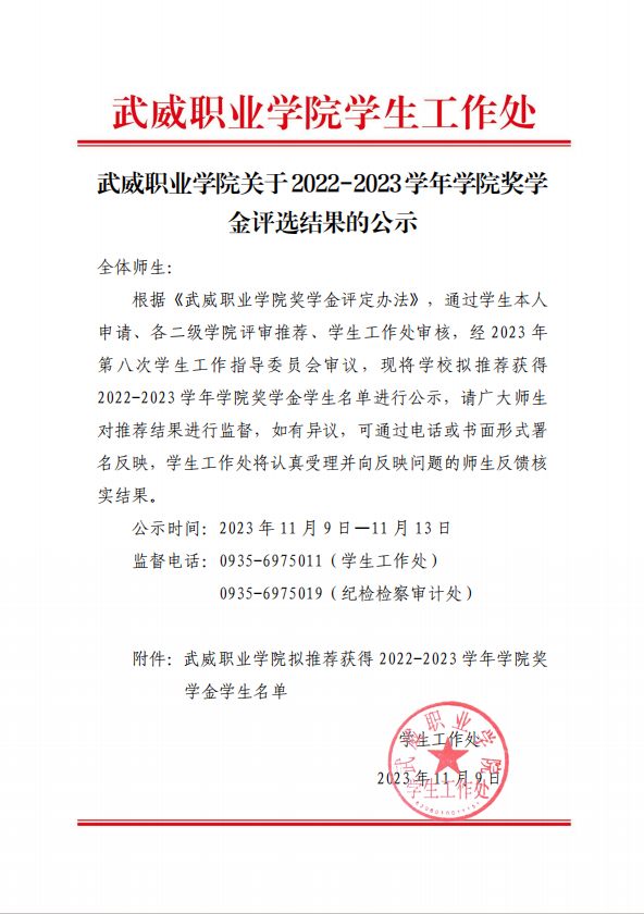 武威職業(yè)學(xué)院關(guān)于2022-2023學(xué)年學(xué)院獎學(xué)金評選結(jié)果的公示