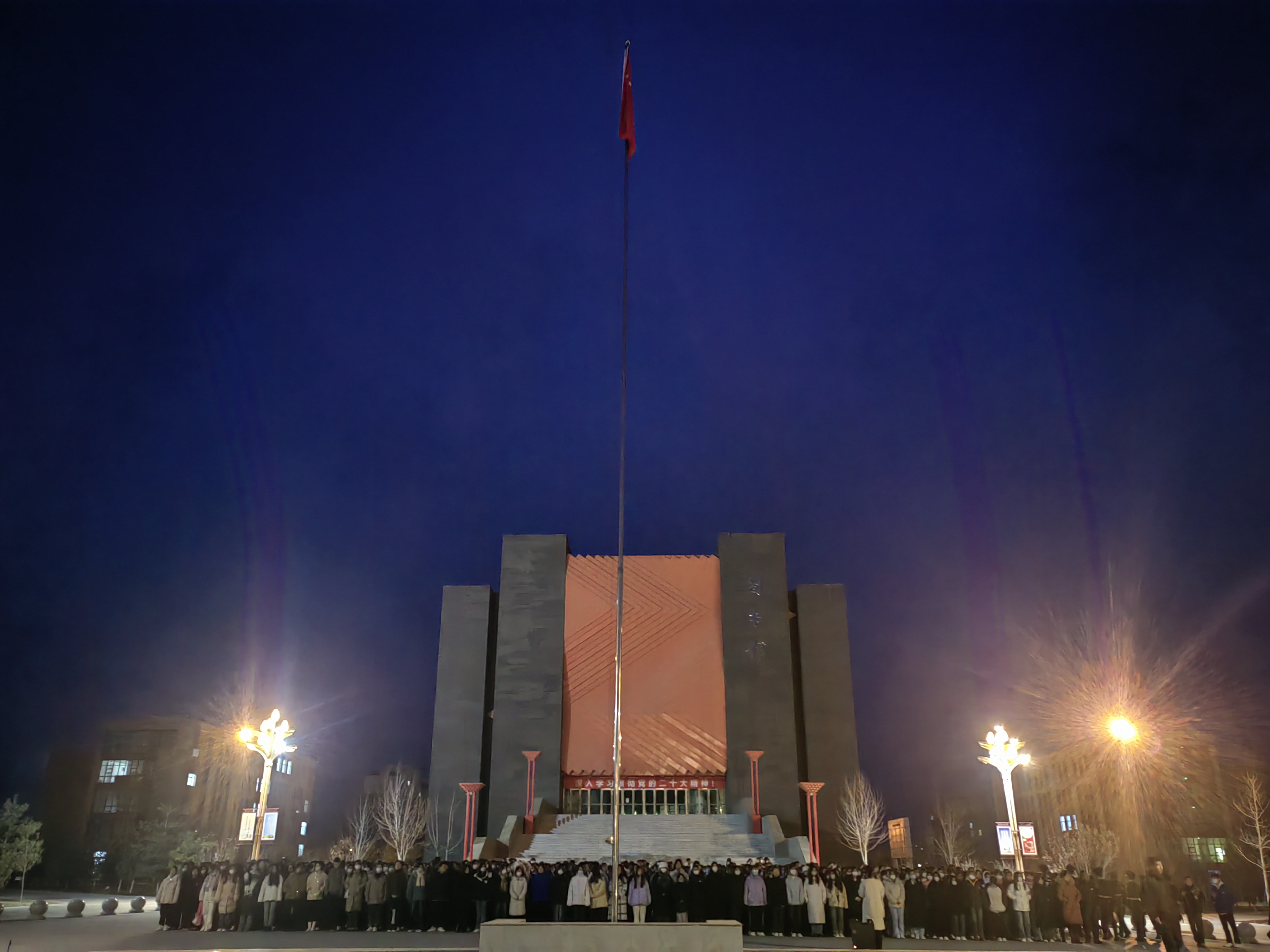 天色微明,國(guó)旗護(hù)衛(wèi)隊(duì)昂首挺胸,邁著鏗鏘有力的步伐護(hù)送國(guó)旗緩緩走向旗臺(tái),全體師生肅然而立,行注目禮,伴隨著莊嚴(yán)的《中華人民共和國(guó)國(guó)歌》,五星紅旗在慷慨激昂的國(guó)歌聲中冉冉升起。