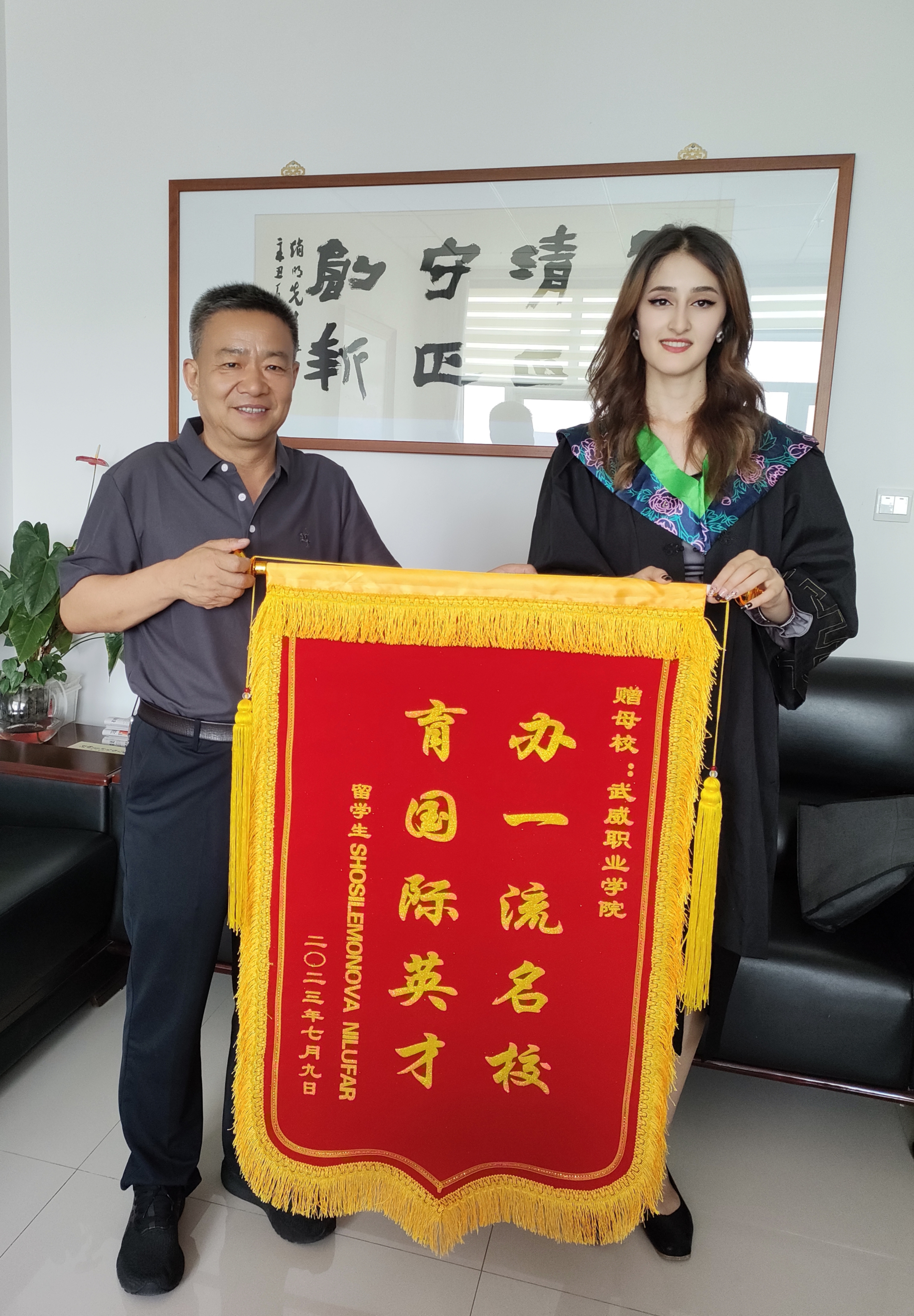 國際學(xué)生HOSILEMONOVA NILUFAR(妮娜)向?qū)W校贈送“辦一流名校 育國際英才”的感謝旌旗,對學(xué)校精心、悉心培養(yǎng)自己表達(dá)了由衷的感謝,表示在武威職業(yè)學(xué)院收獲了專業(yè)技能和人生閱歷,接觸到了先進(jìn)技術(shù)技能和前沿思想,特別是通過學(xué)習(xí)中國文化,深刻認(rèn)識到文化交流的重要性,也更加堅定了自己繼續(xù)學(xué)習(xí)中文和中國文化的決心。