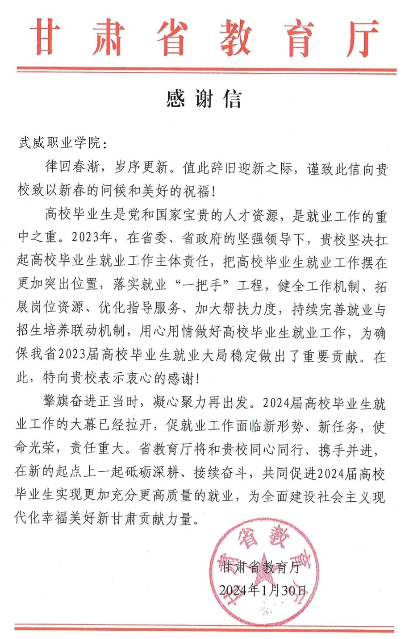 這些感謝信是對學校畢業(yè)生就業(yè)工作的肯定,也是激勵學校奮步前行的動力。學校將繼續(xù)在甘肅省教育廳的指導下,在與社會各界的通力合作下,一起砥礪深耕、接續(xù)奮斗,共同促進2024屆高校畢業(yè)生實現更加充分更高質量的就業(yè)。